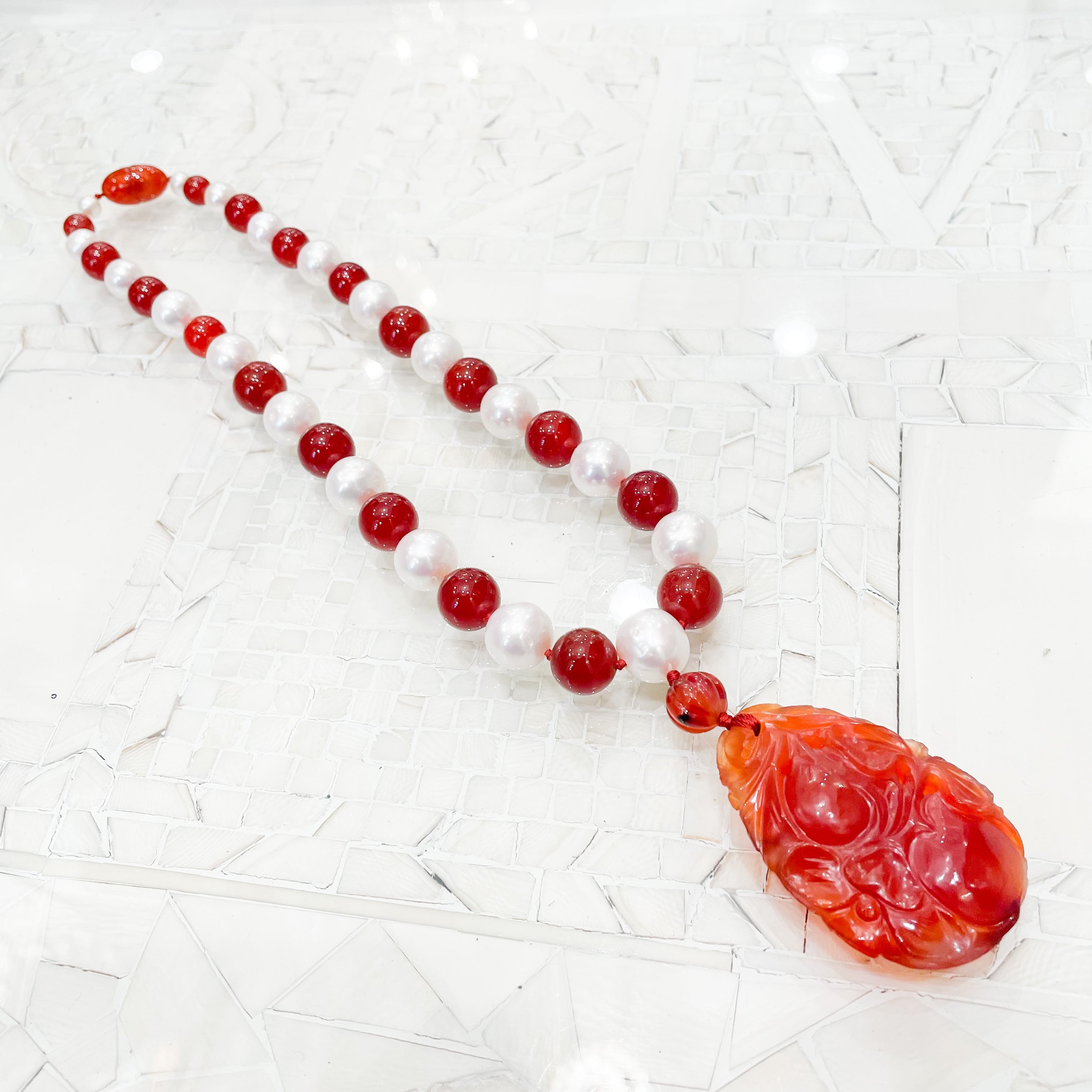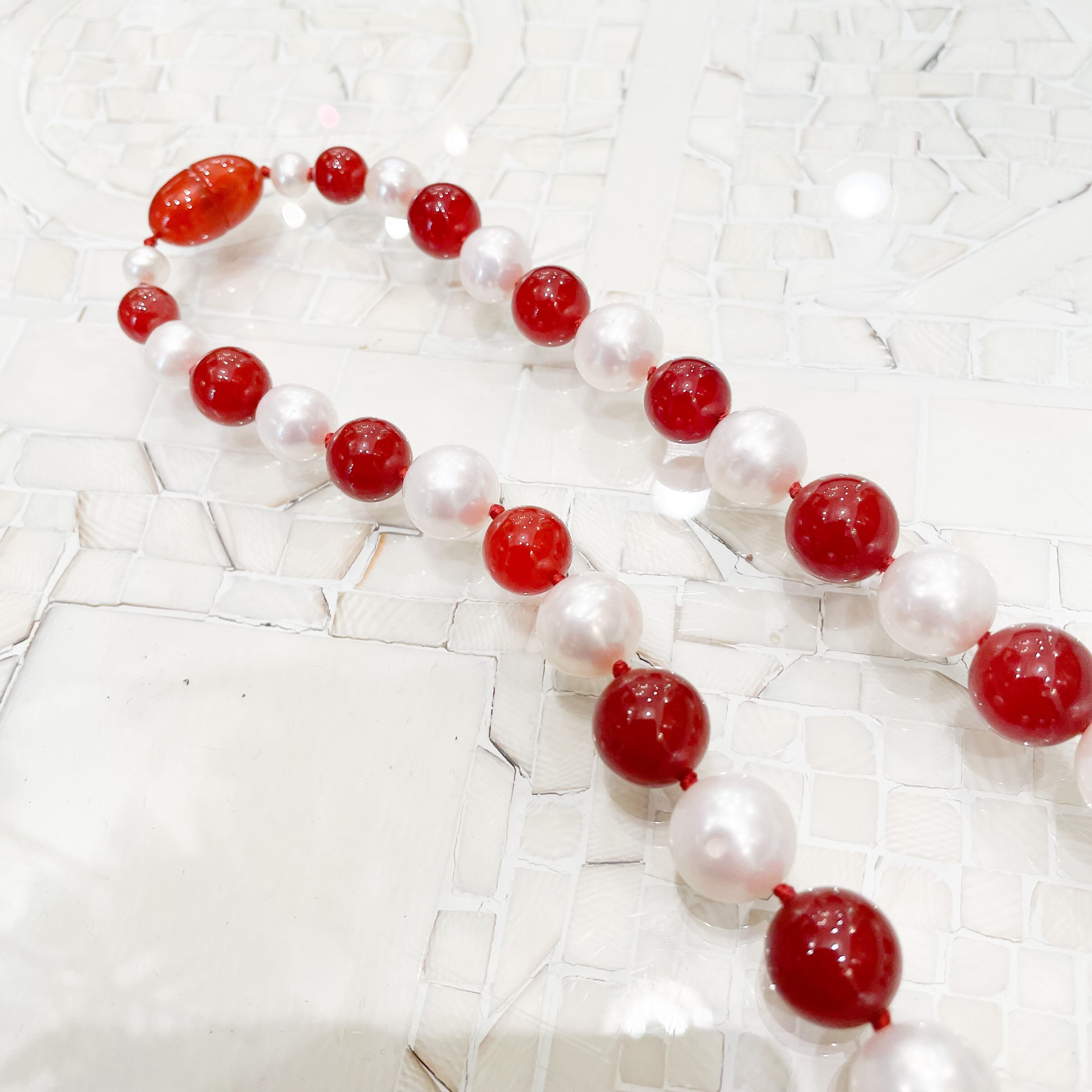 瑪瑙の赤と真珠の白がハッキリとしたコントラストが個性的な大ぶりのネックレスです。