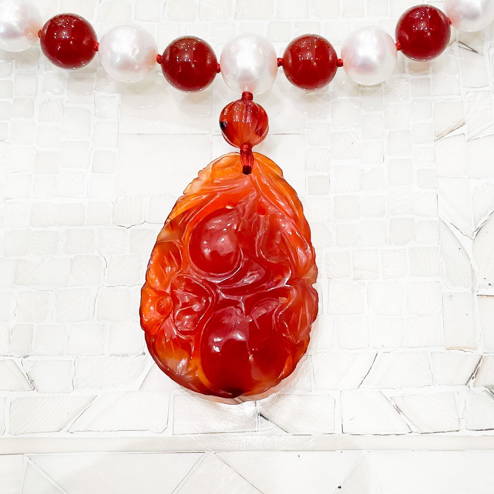 赤瑪瑙と真珠に桃と鳥の彫りの赤瑪瑙が揺れるネックレス