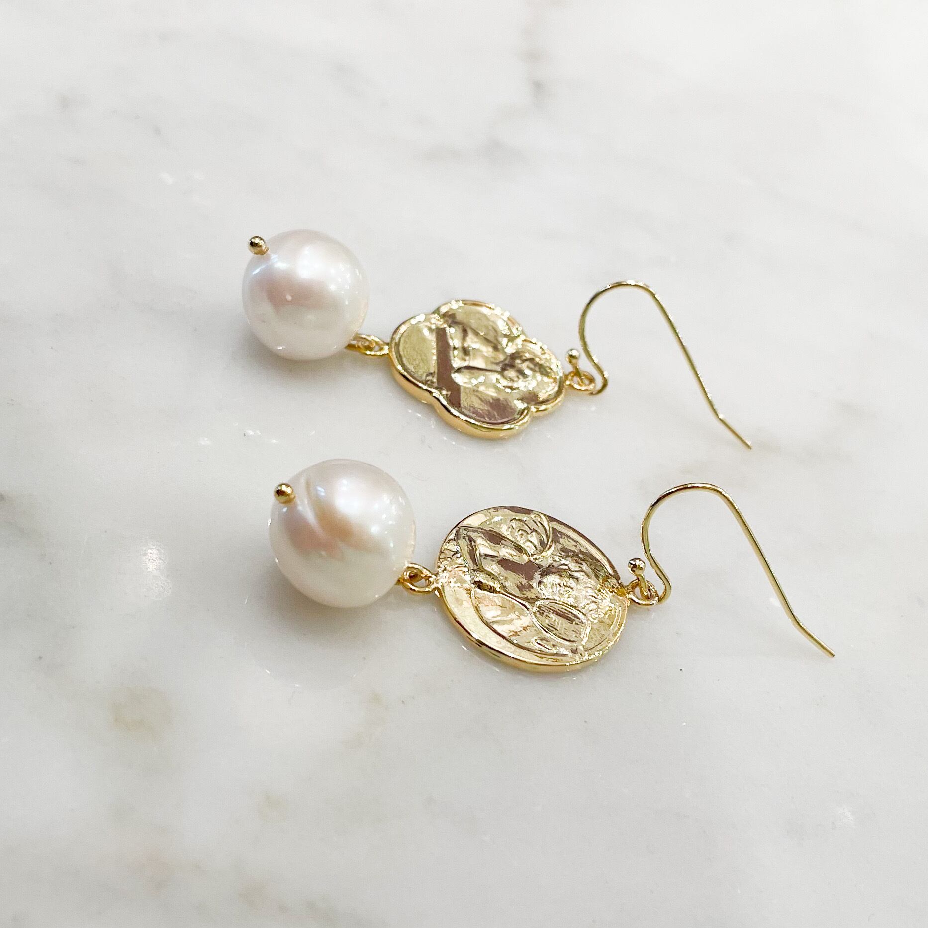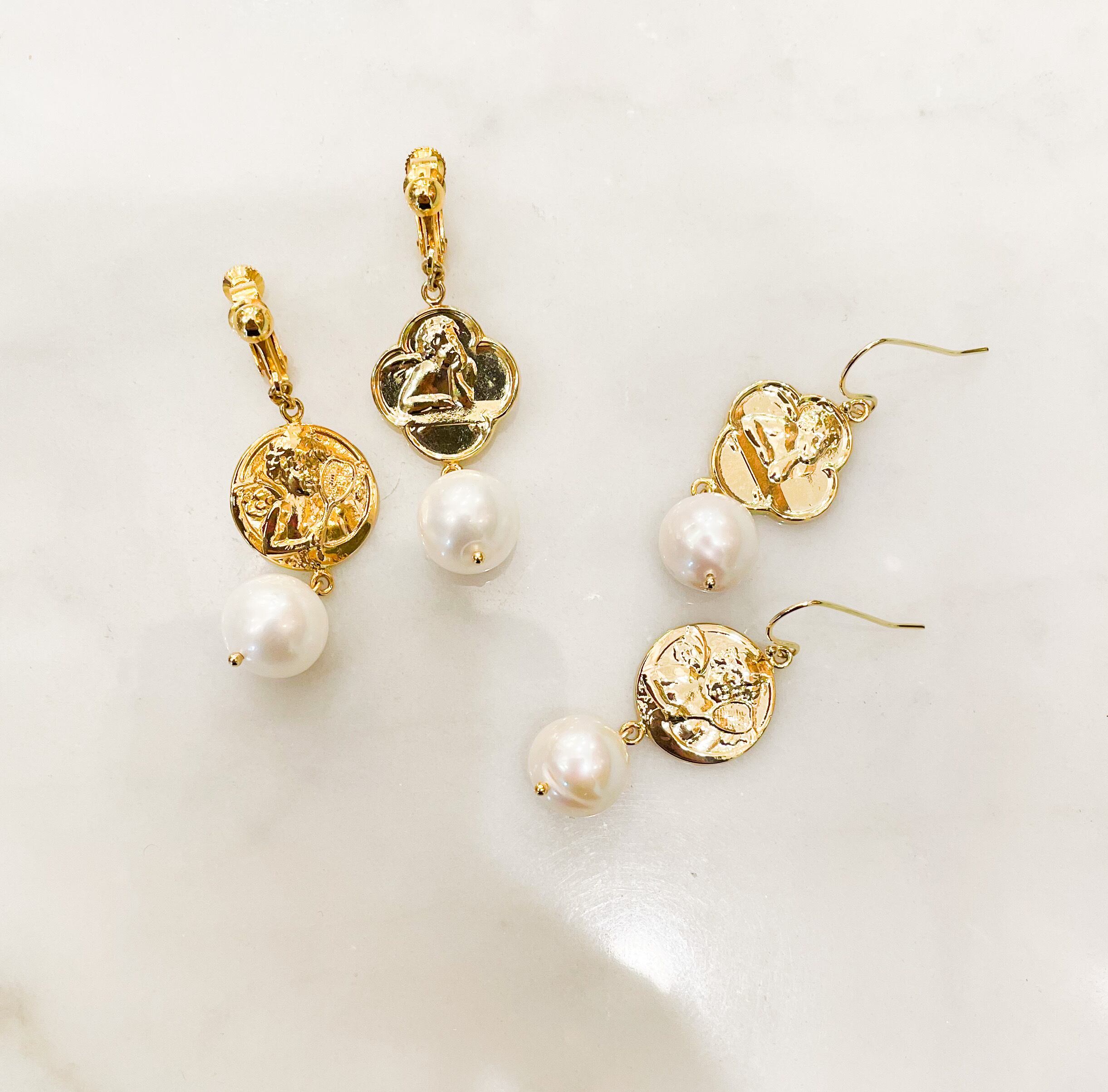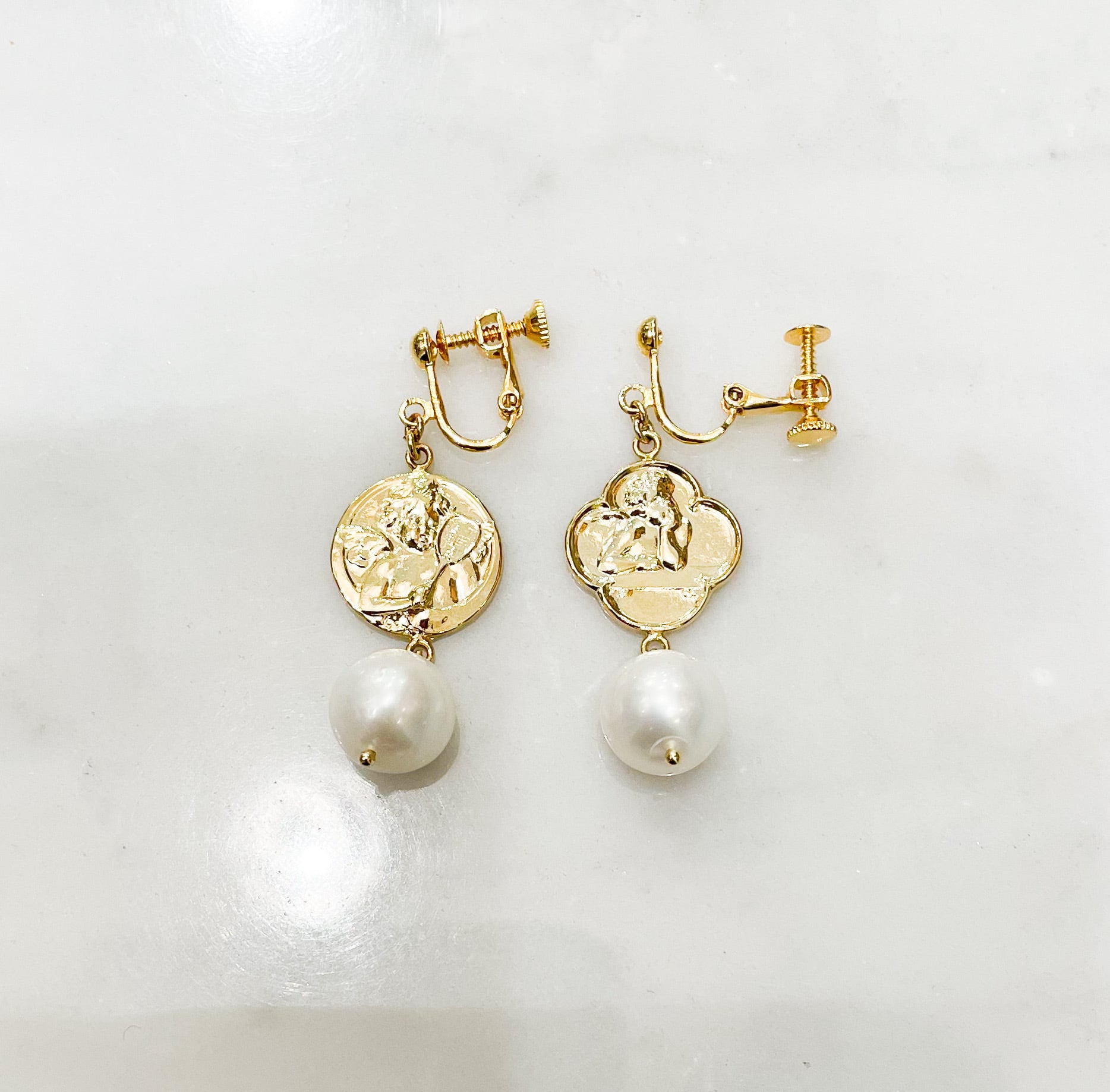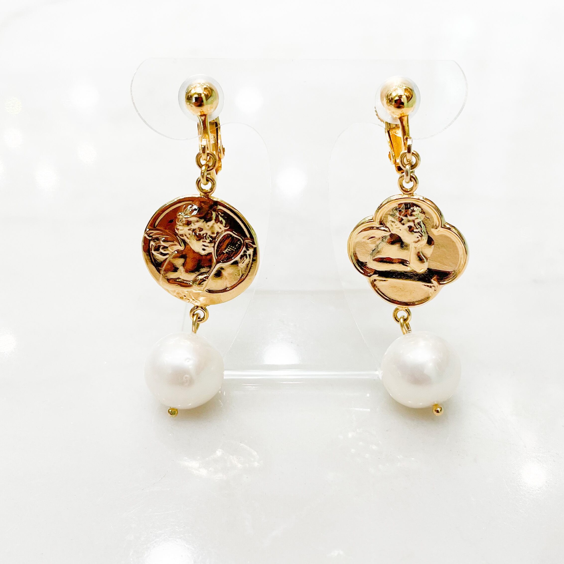 2種類の金色の天使のパーツに真珠が揺れるピアス・イヤリング