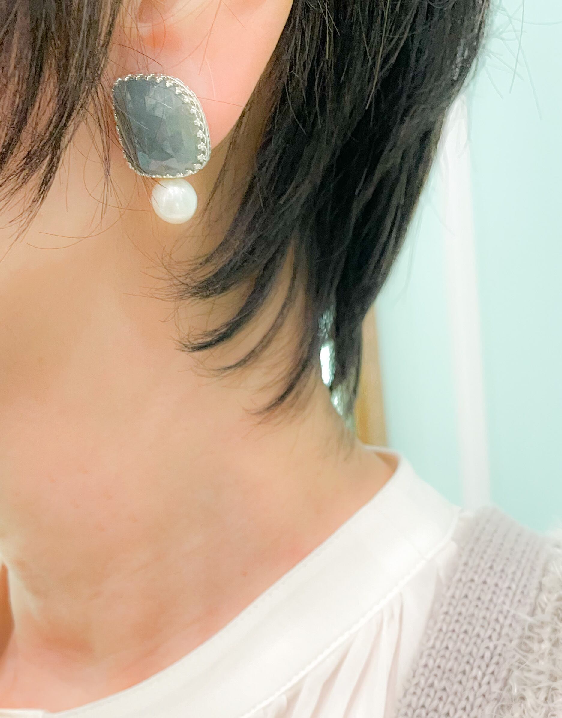まん丸な8mmアップの真珠もそれだけでもアクセサリーとして使えるくらいの存在感なのですが、こうして個性的なサファイアと組み合わせてみると、また別の魅力をみせてくれます。
