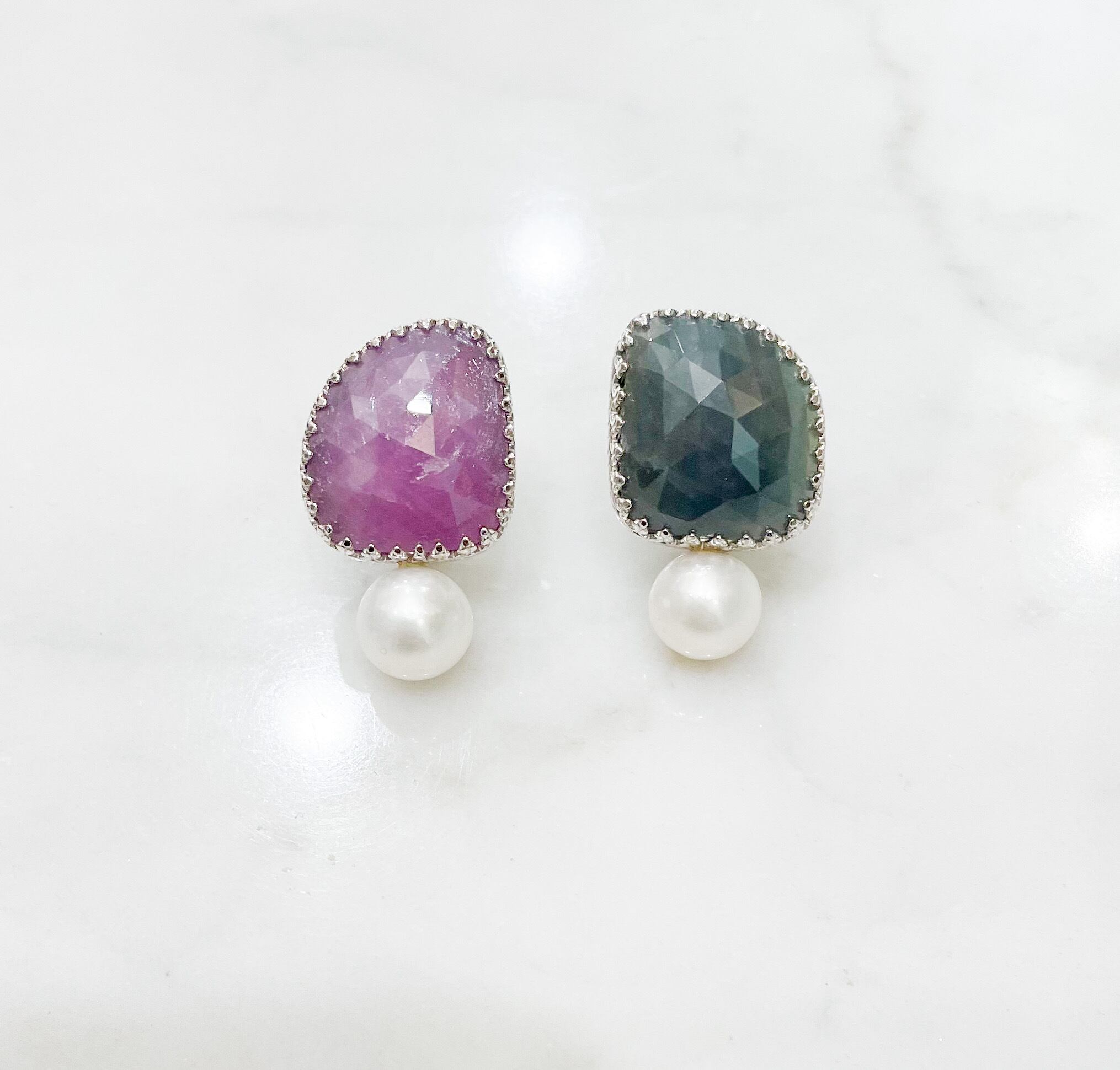 歪んだ台形のような形のピンクサファイアとブルーグレーのサファイアを可愛らしいシルバー製の爪で巻いて、その下に8mmアップの真珠をセット。