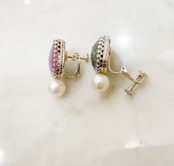 シルバーで王冠留めされたピンクとブルーグレーのサファイア(23.38ct)と真珠のシルバーイヤリング