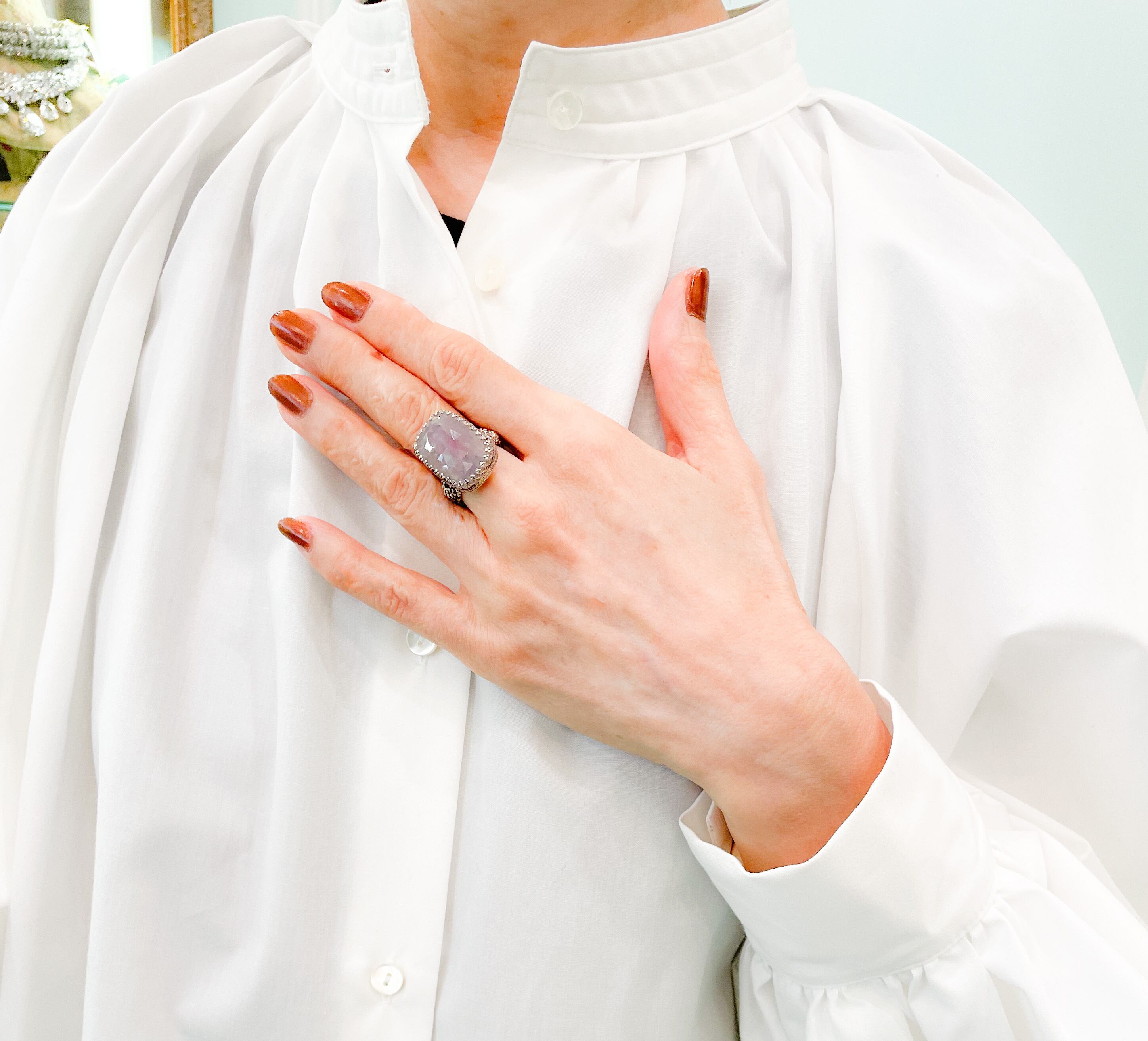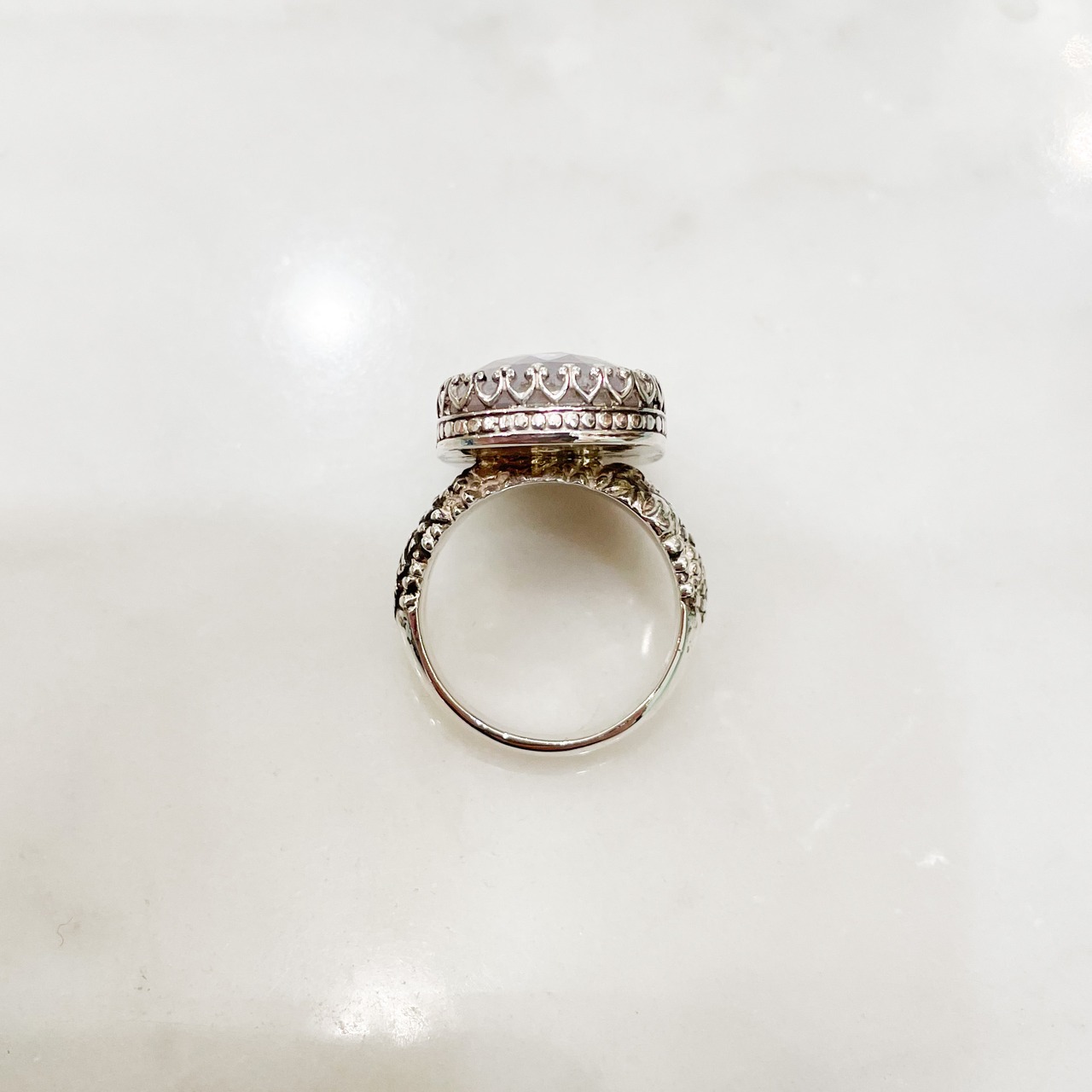 薔薇の模様が深掘りされたシルバー台、そしてティアラのような爪は時間が経つとアンティークなような風合いに変じていきます。
