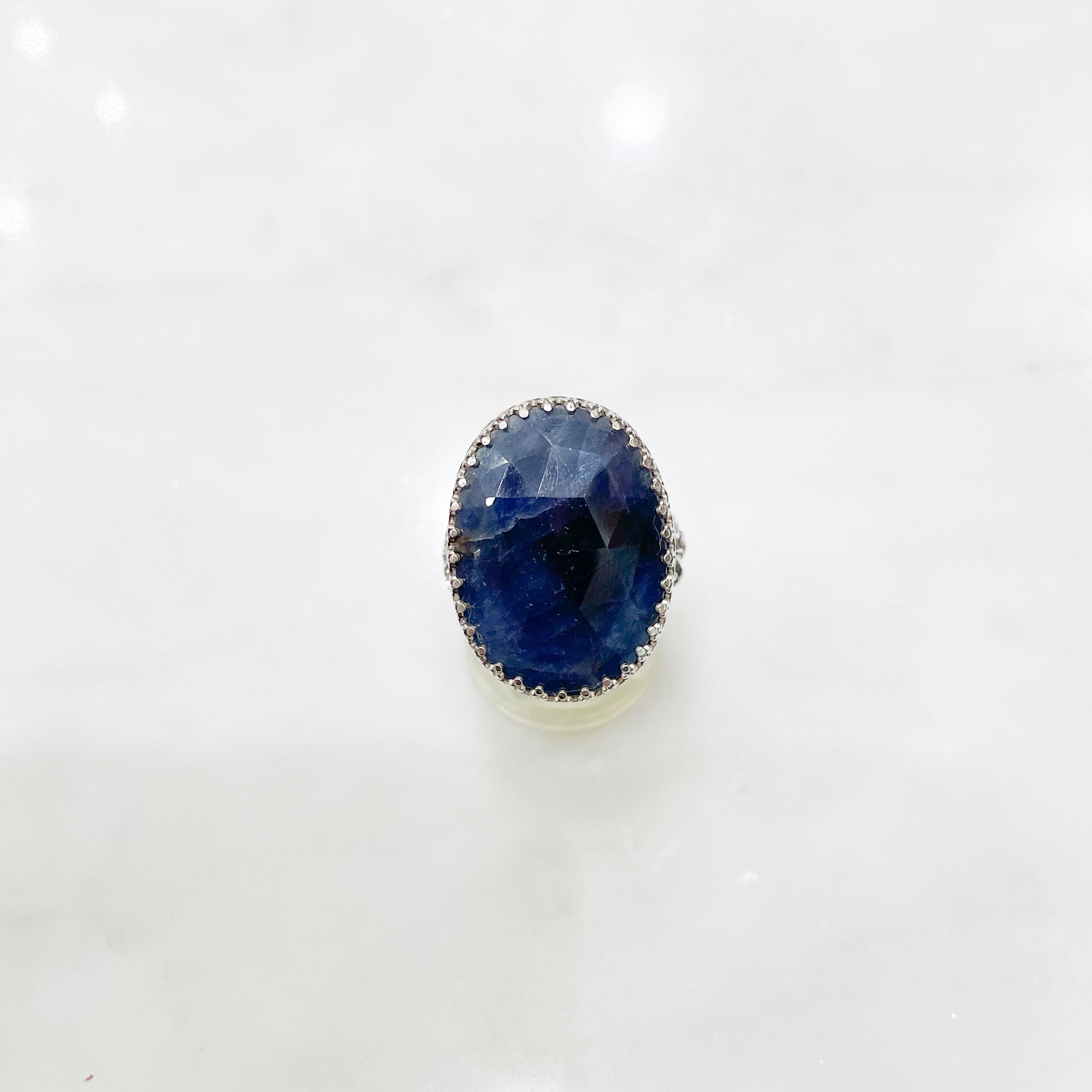 シルバーで王冠留めされた楕円形のブルーサファイア(20.67ct)のリング