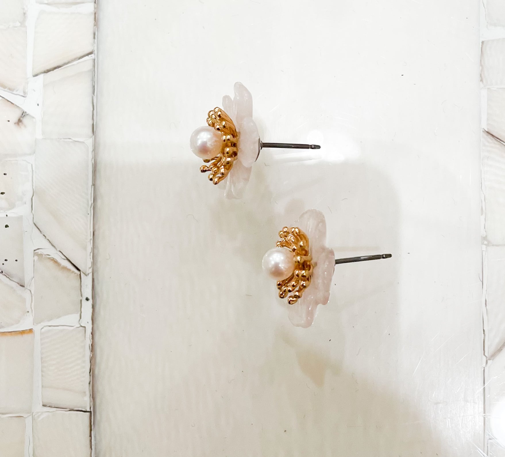 そして直径4mmほどの小さな真珠があしらわれていて、優しいトーンの紅水晶に華やかさと存在感を足してくれています。