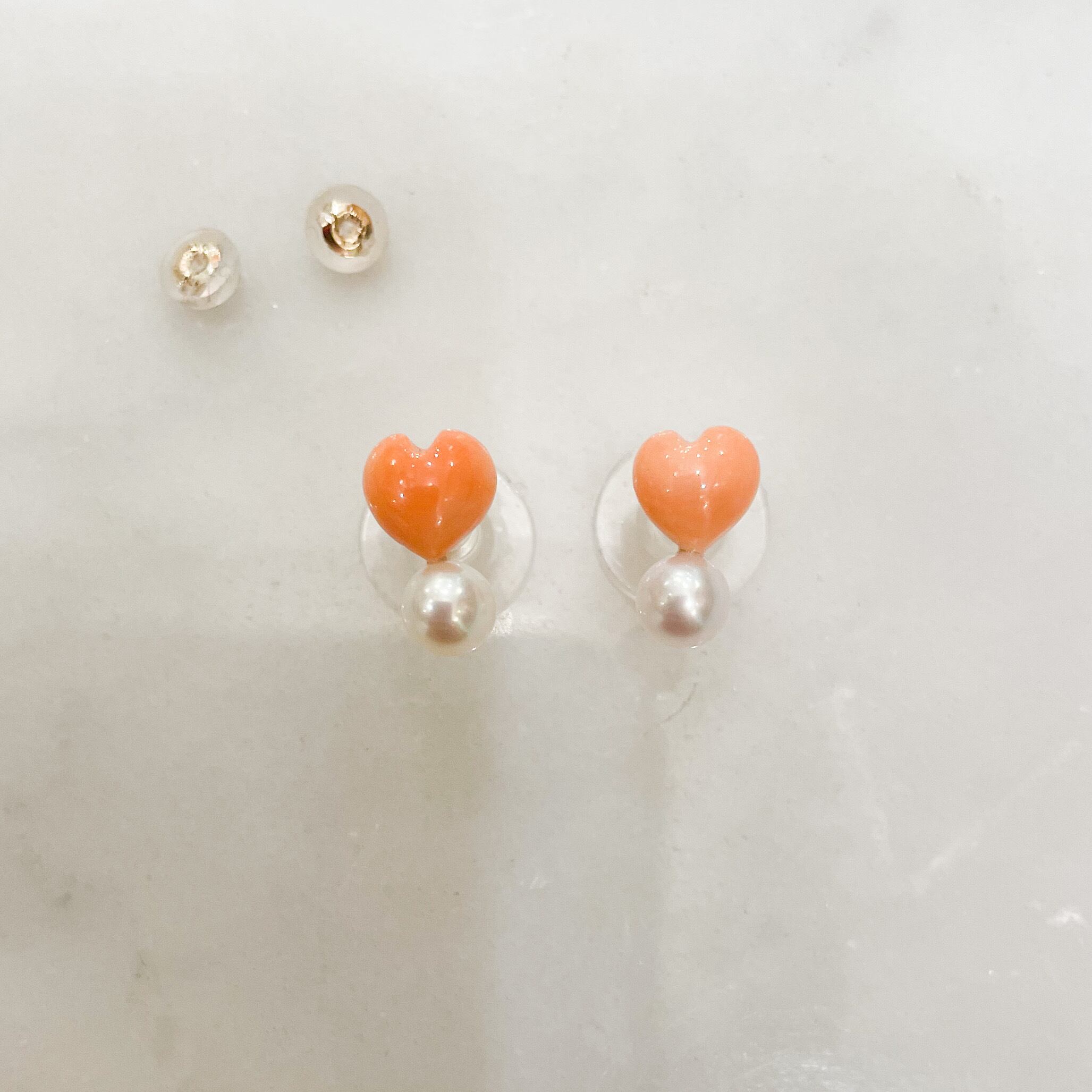 7×7mmほどの珊瑚で作られたハートの下に、5mmの白い真珠を重なるようにつけたピアスです。