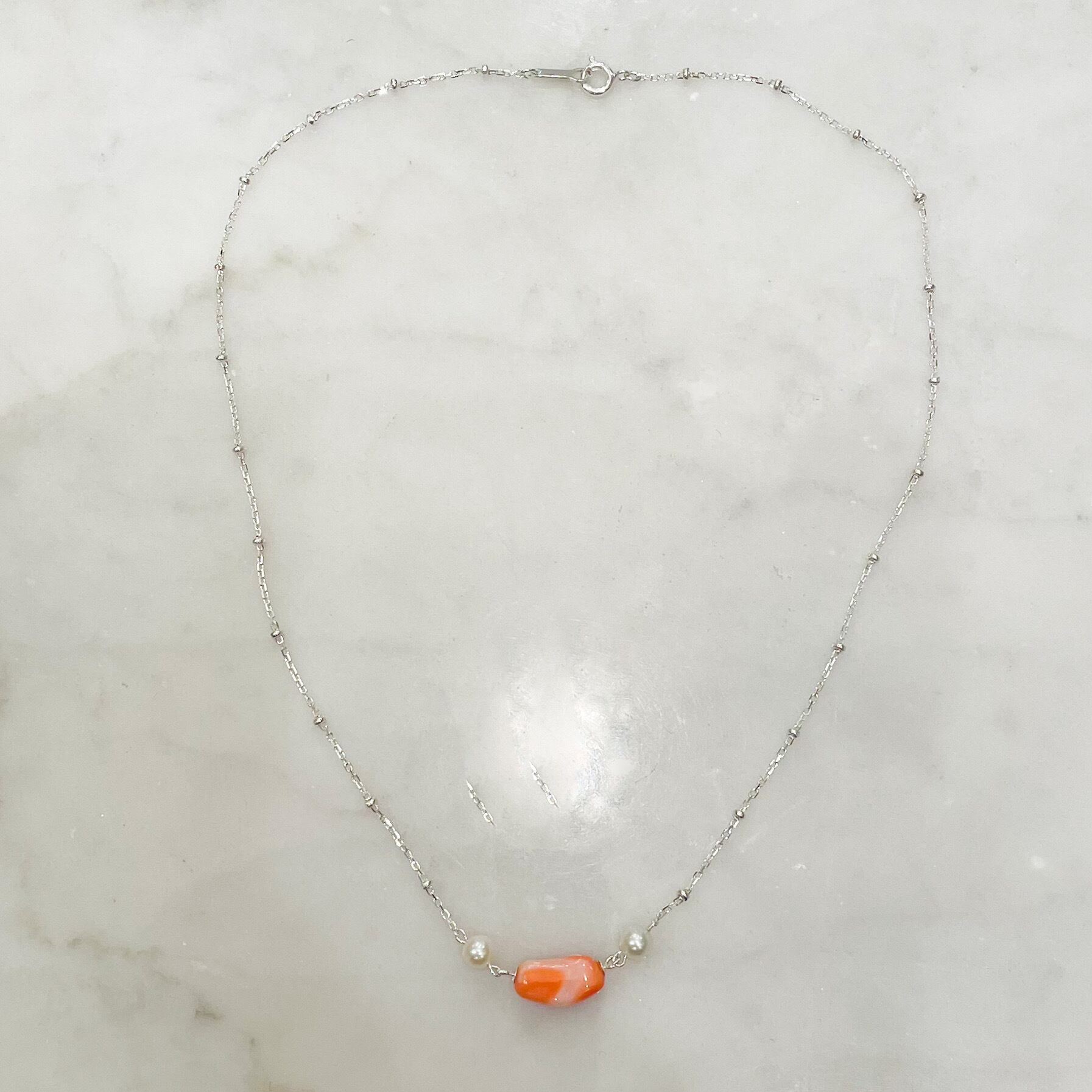 ビーンズ形の珊瑚に小さな和珠のシルバーチェーンネックレス