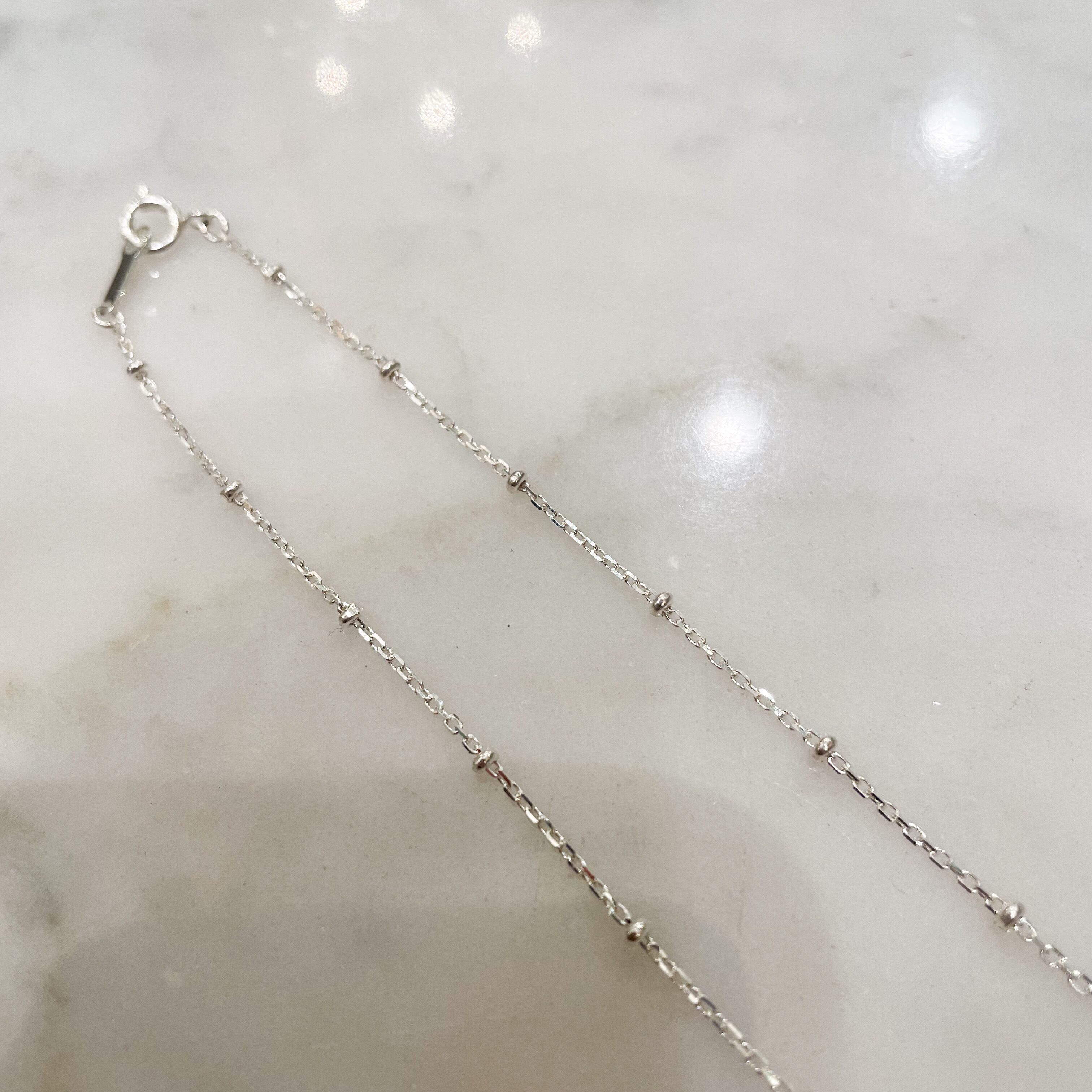 細いテーパーチェーンは面があるのでキラキラと輝き、カットビーズも施されているので、チェーン自体がとても装飾的です。
