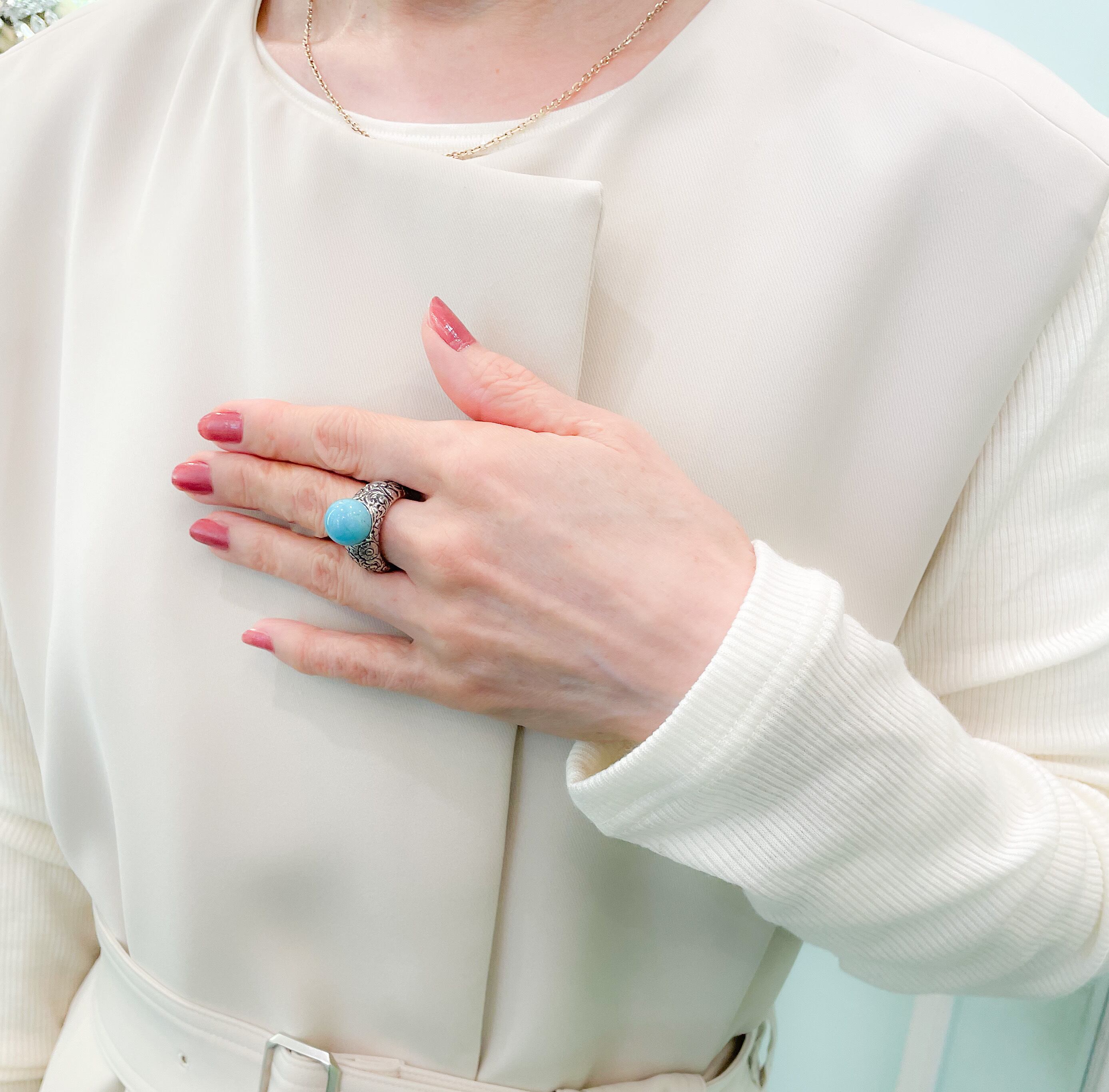 12mmのターコイズ、薔薇模様の月甲型シルバーリング