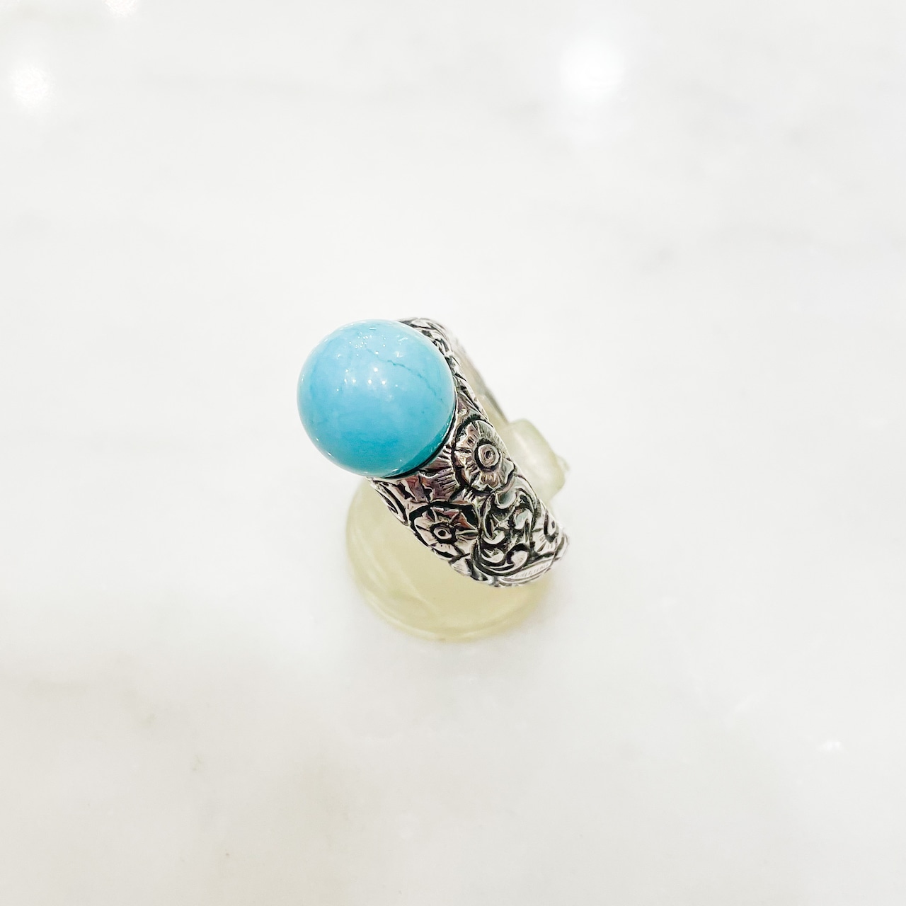 少しボリューム感のある月甲型のシルバー台にまん丸のターコイズを載せたシンプルな形のリングです。