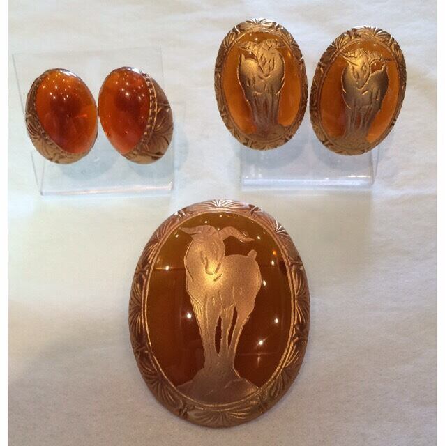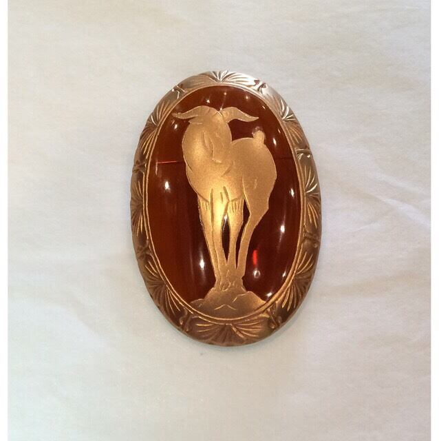 白べっ甲風の樹脂に金彩 アーカンサス模様と山羊のモチーフのブローチ(大)