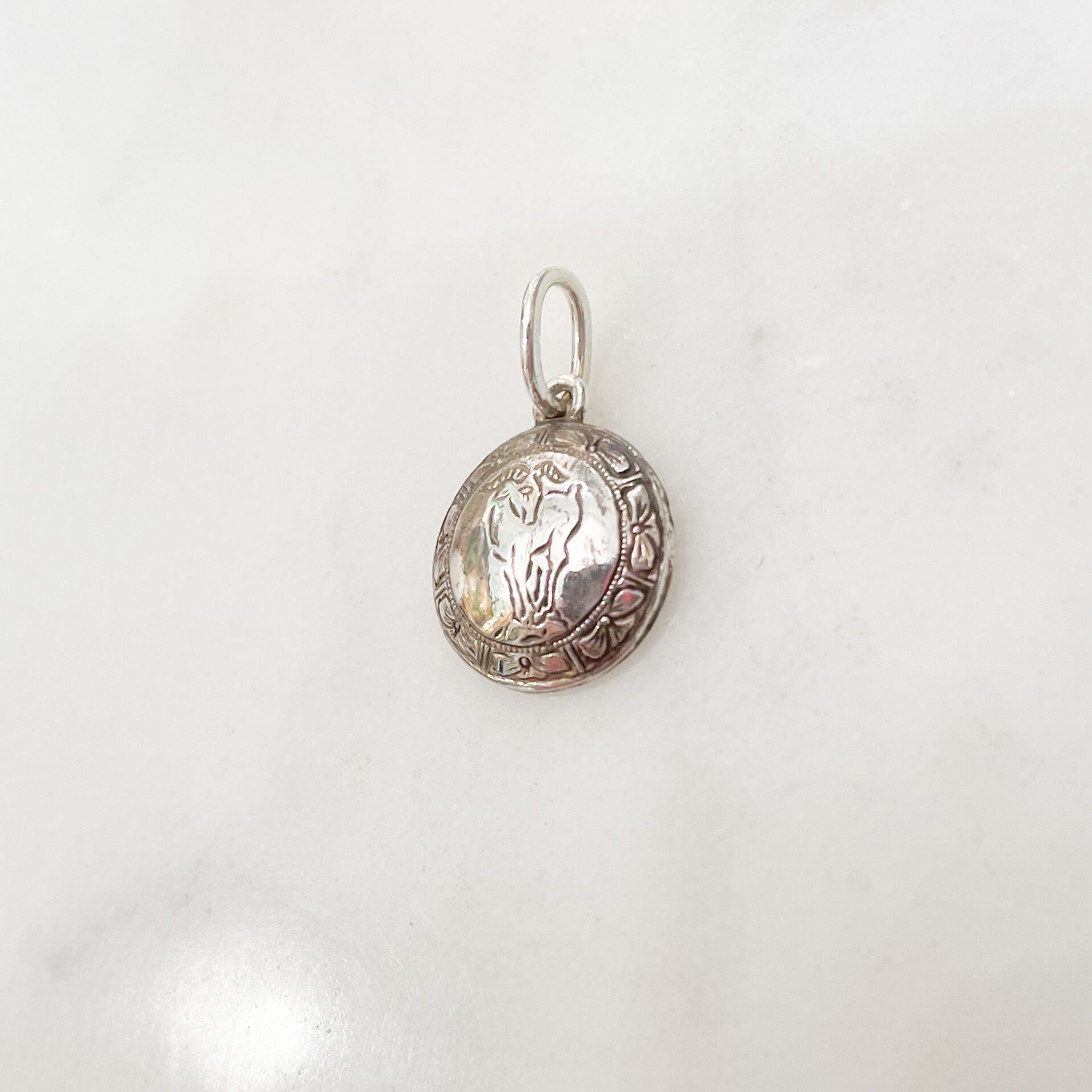 岩場に立つ山羊とアーカンサス模様のフレームのシルバー・ピンクシルバーのチャーム(丸)