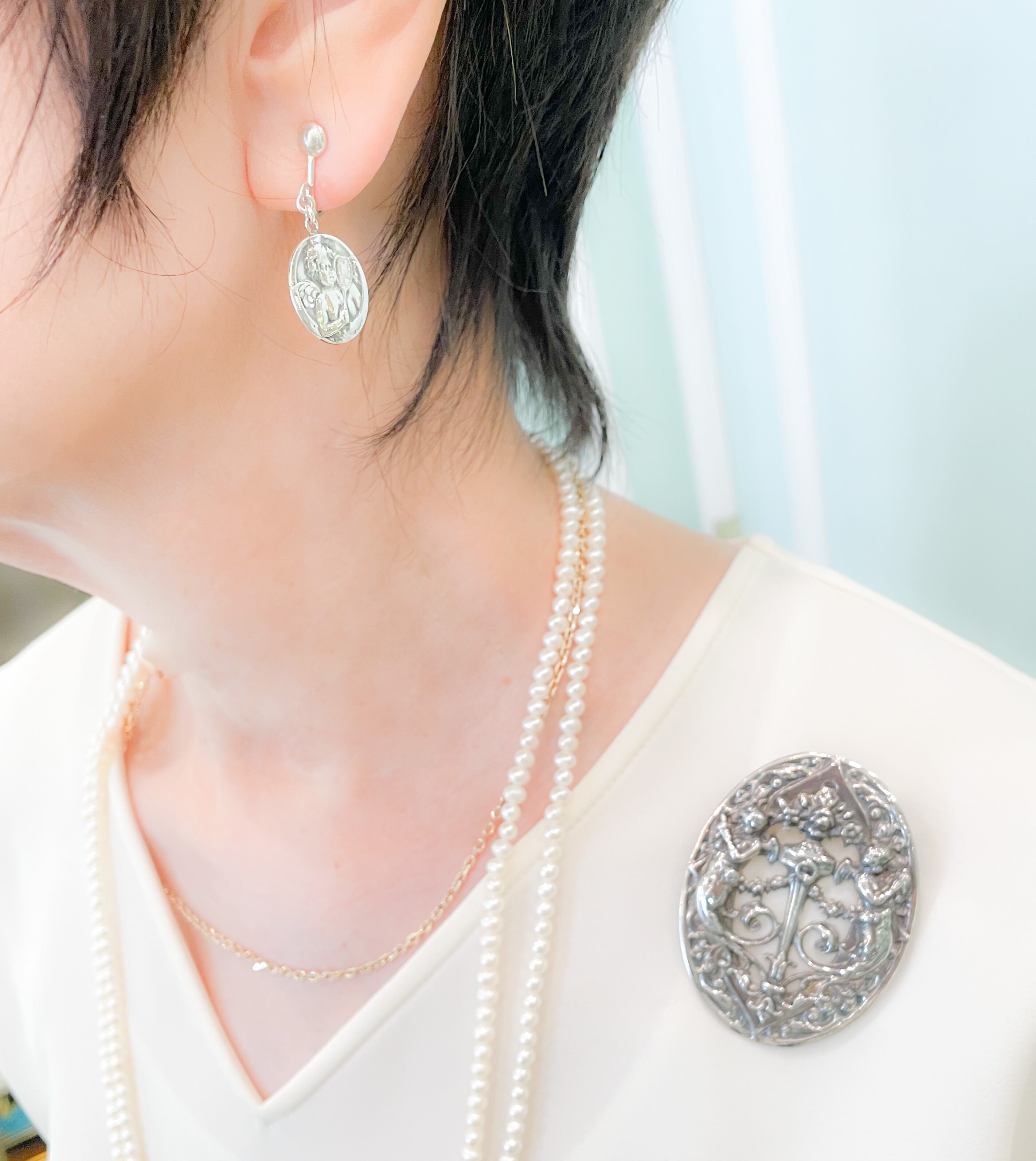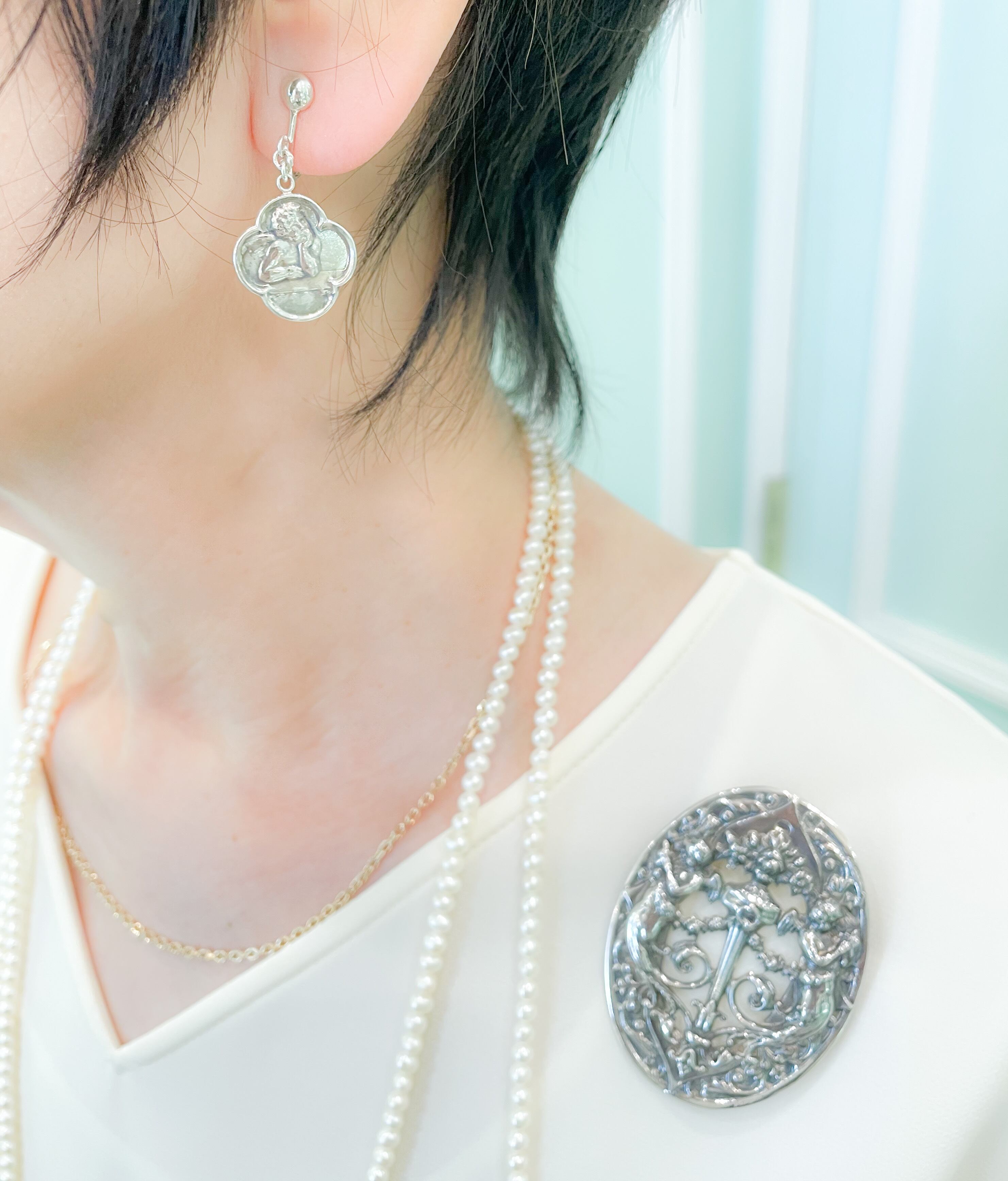 ユラユラと左右で異なる天使モチーフが揺れるのですが、燻したシルバーのトーンで甘くなりすぎず、合わせやすいイヤリングになっています。