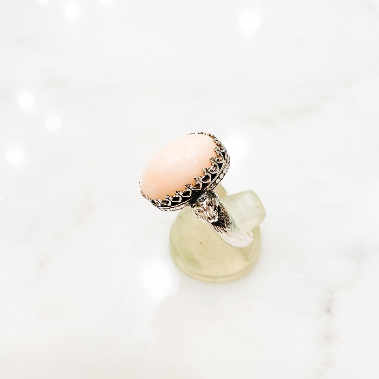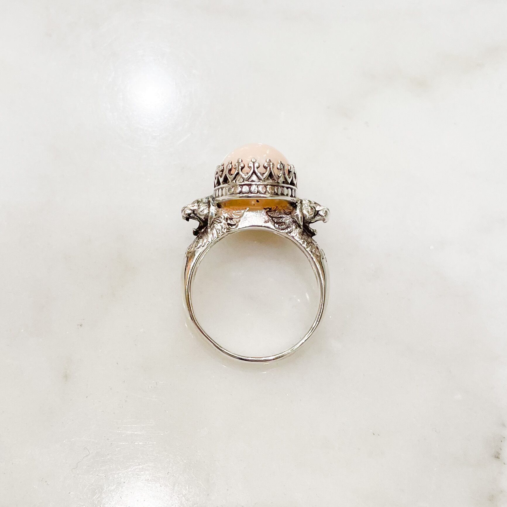 王冠留めされた縦長の桃色珊瑚、ニ頭のライオンのシルバーリング