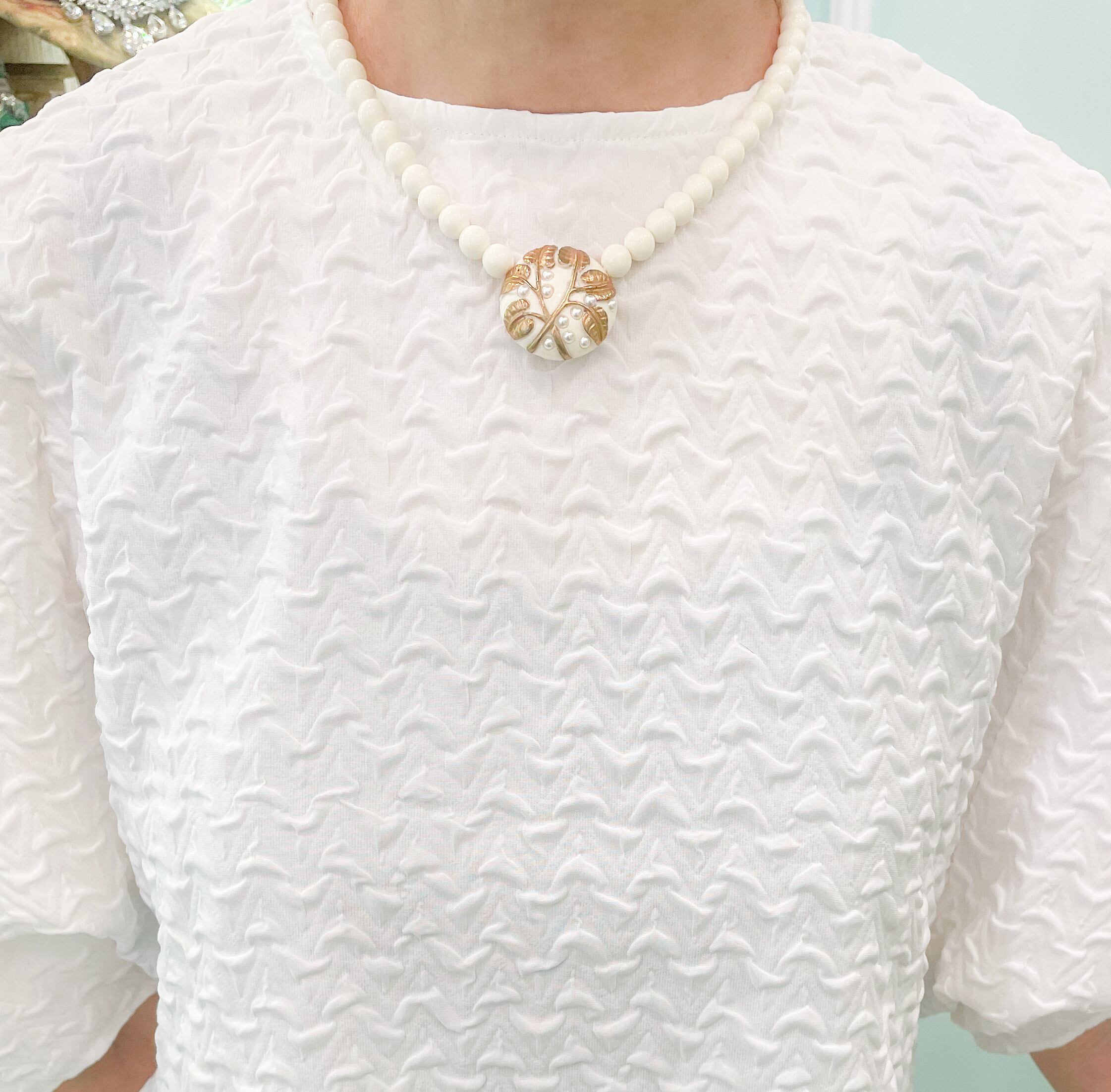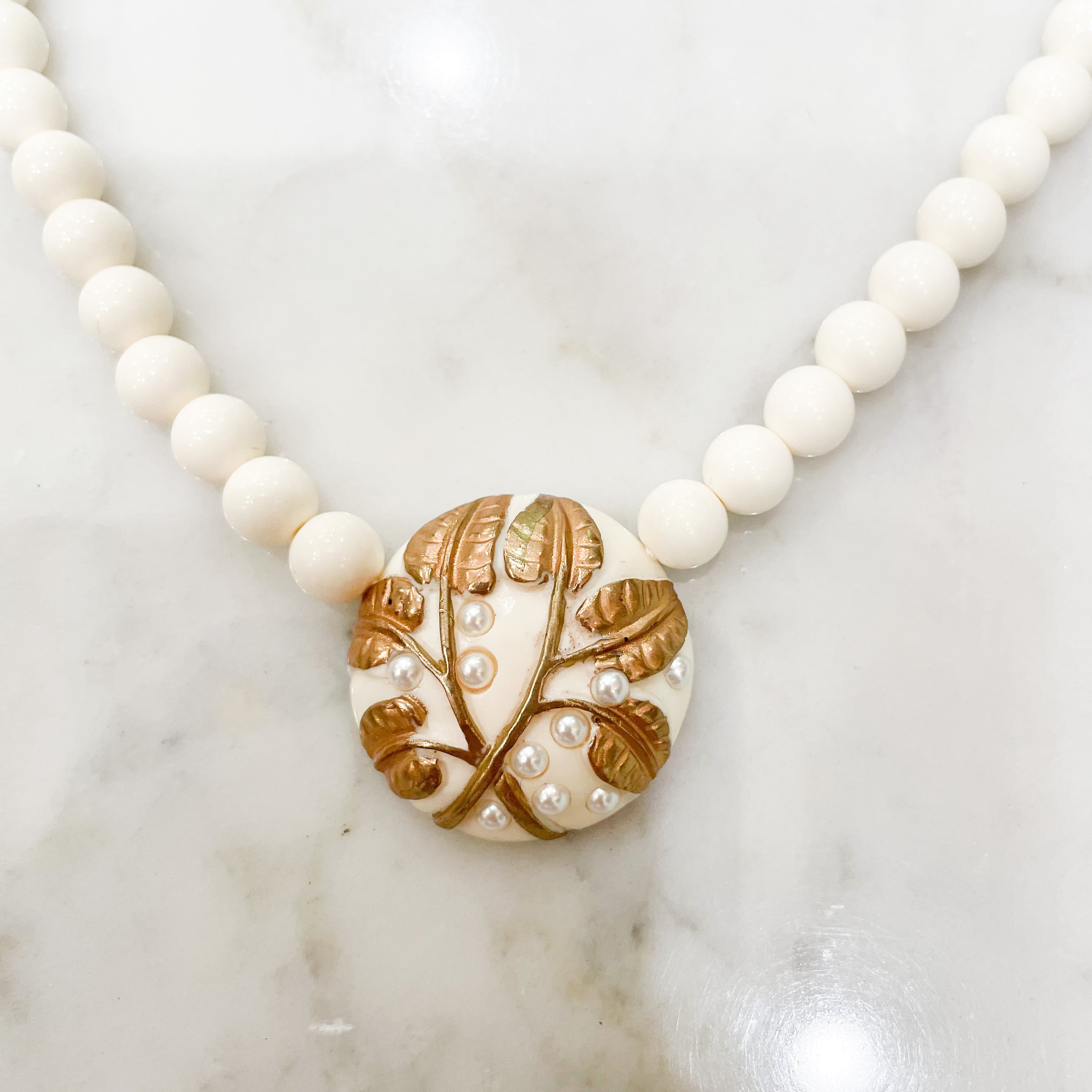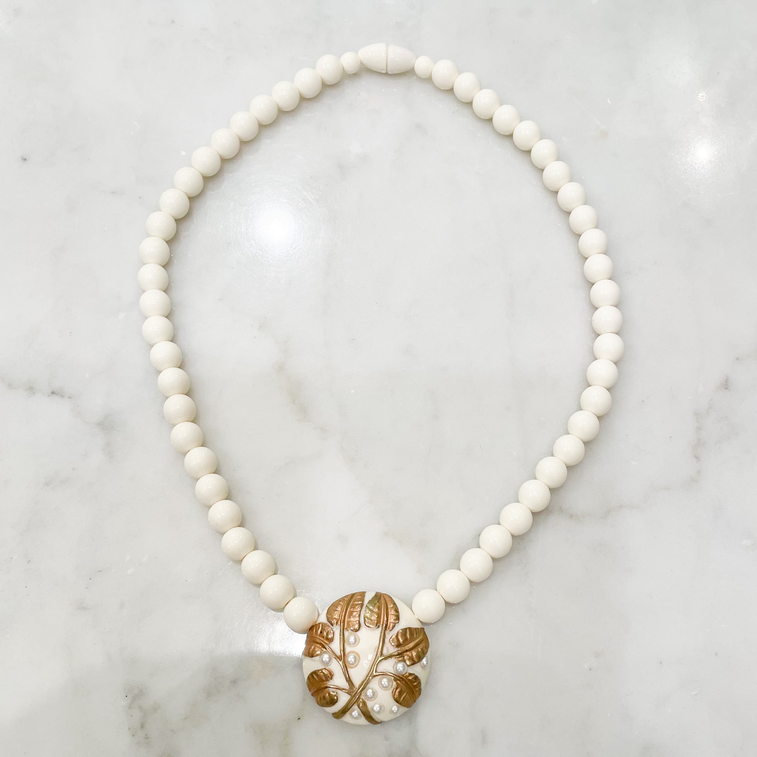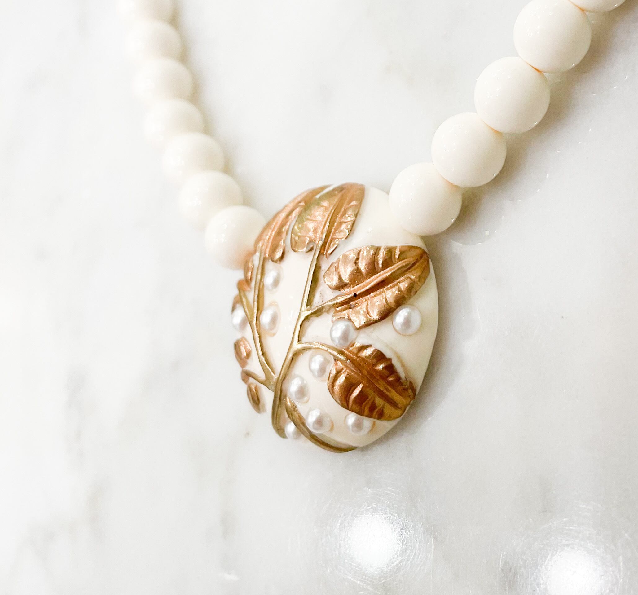 樹脂に金彩とパール、植物模様が浮き彫りのようにされたネックレス