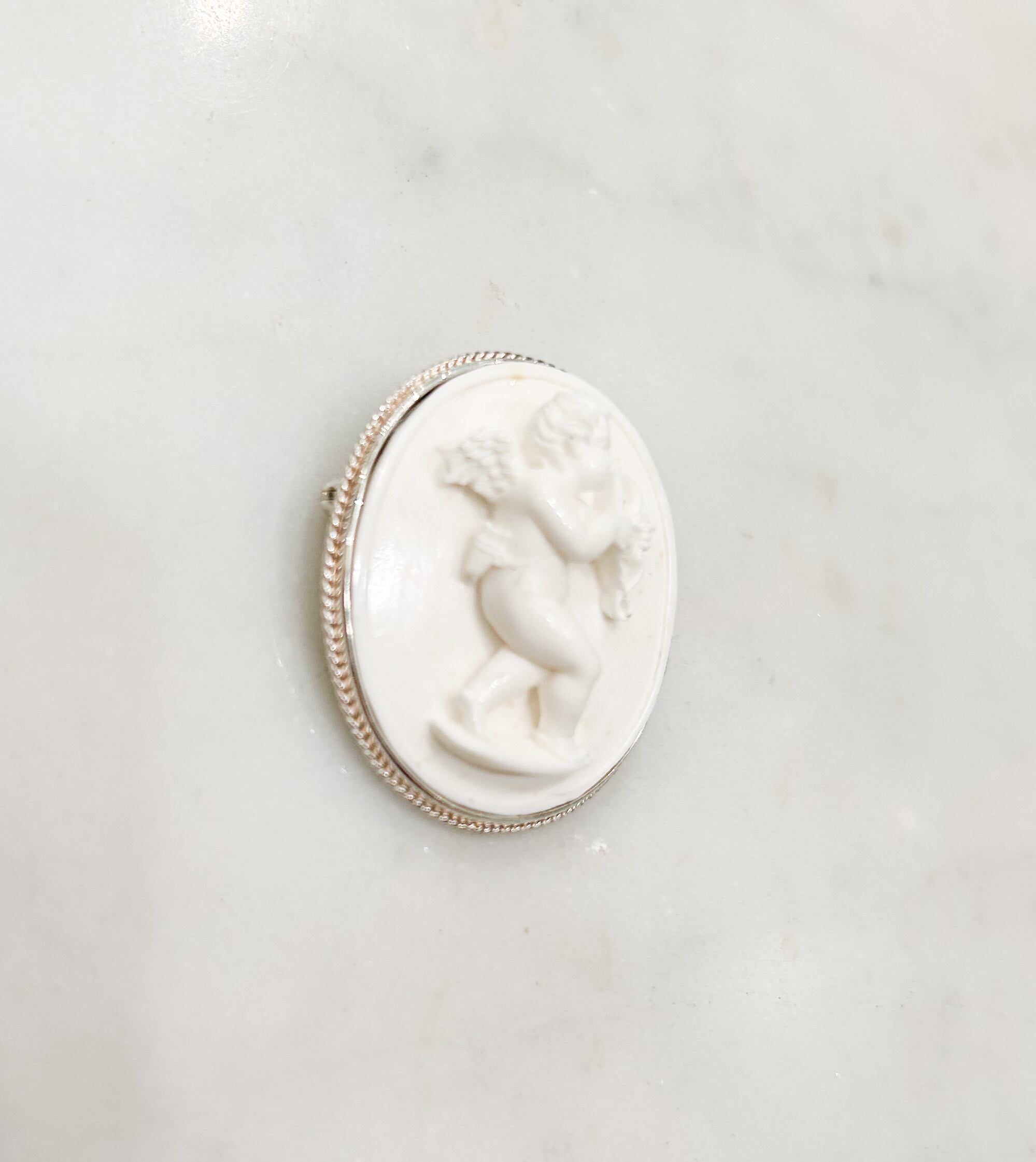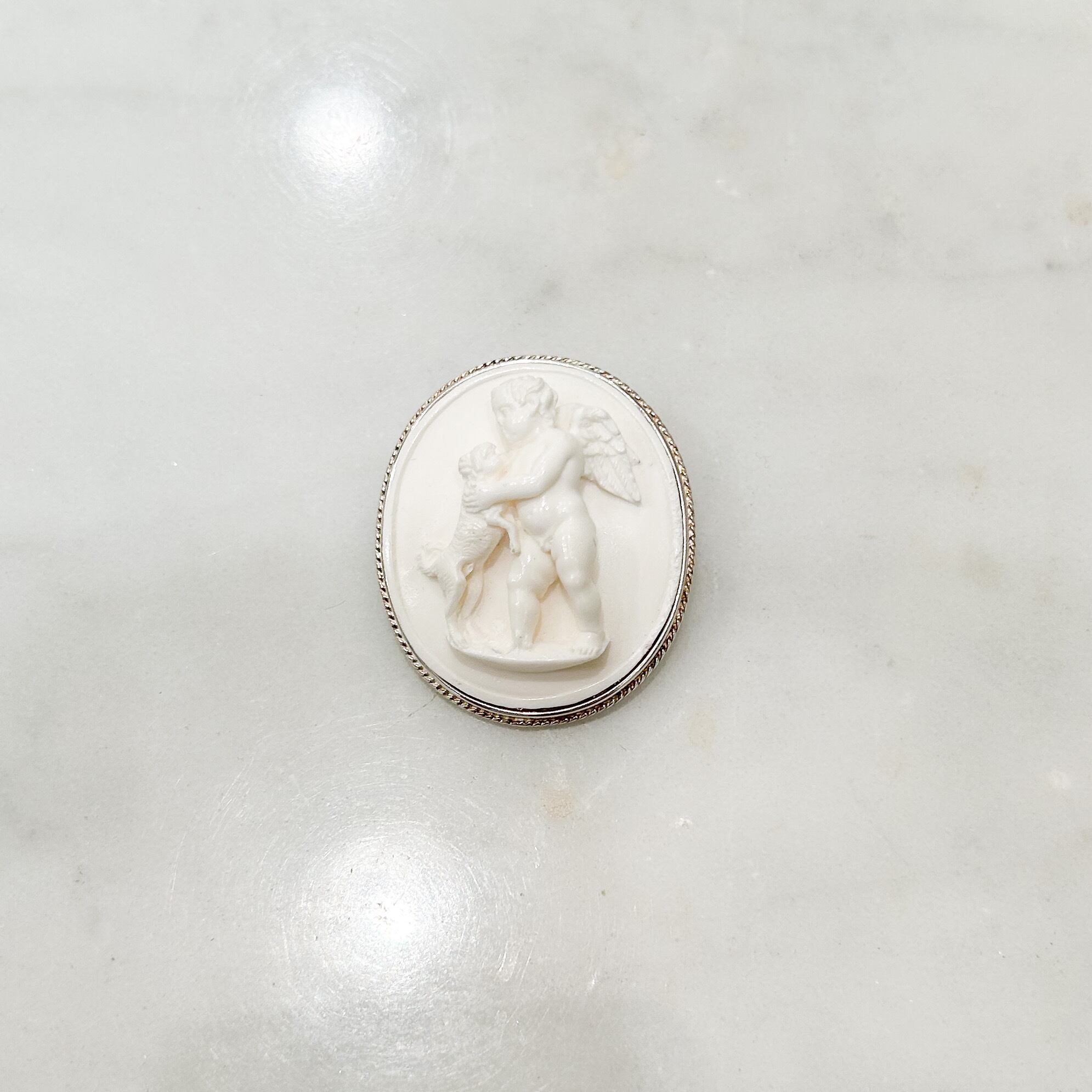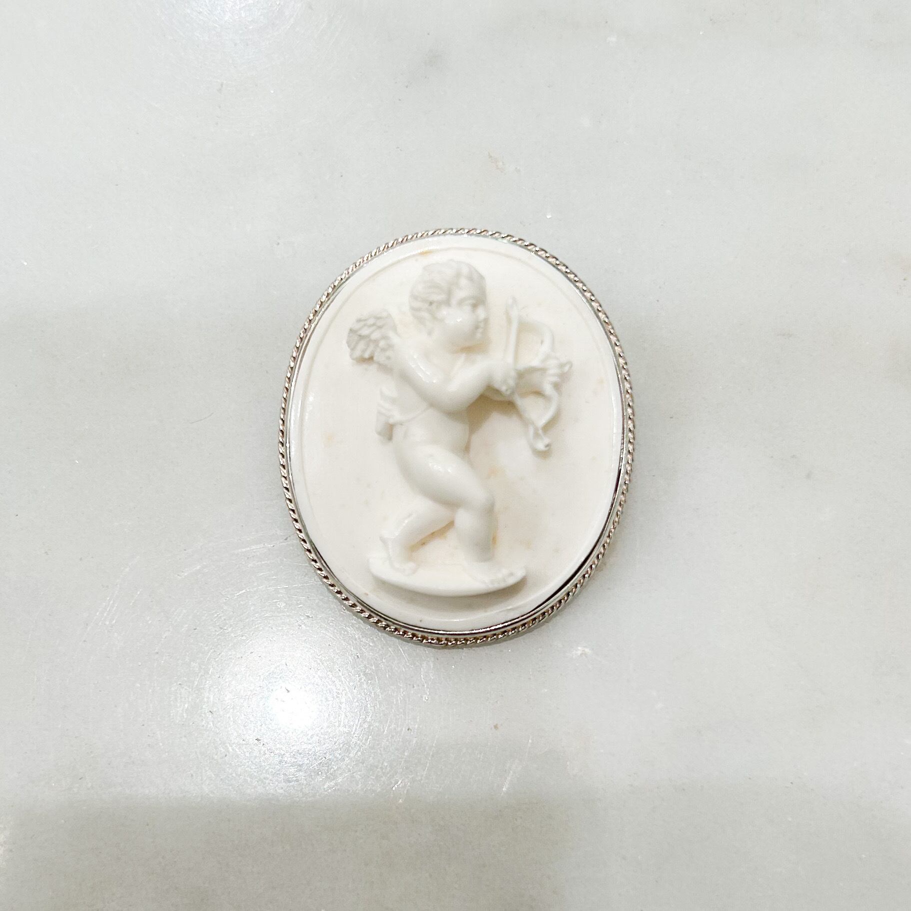 キューピッドのモチーフのニューラーヴァカメオシルバーペンダント兼ブローチ(チェーン別)