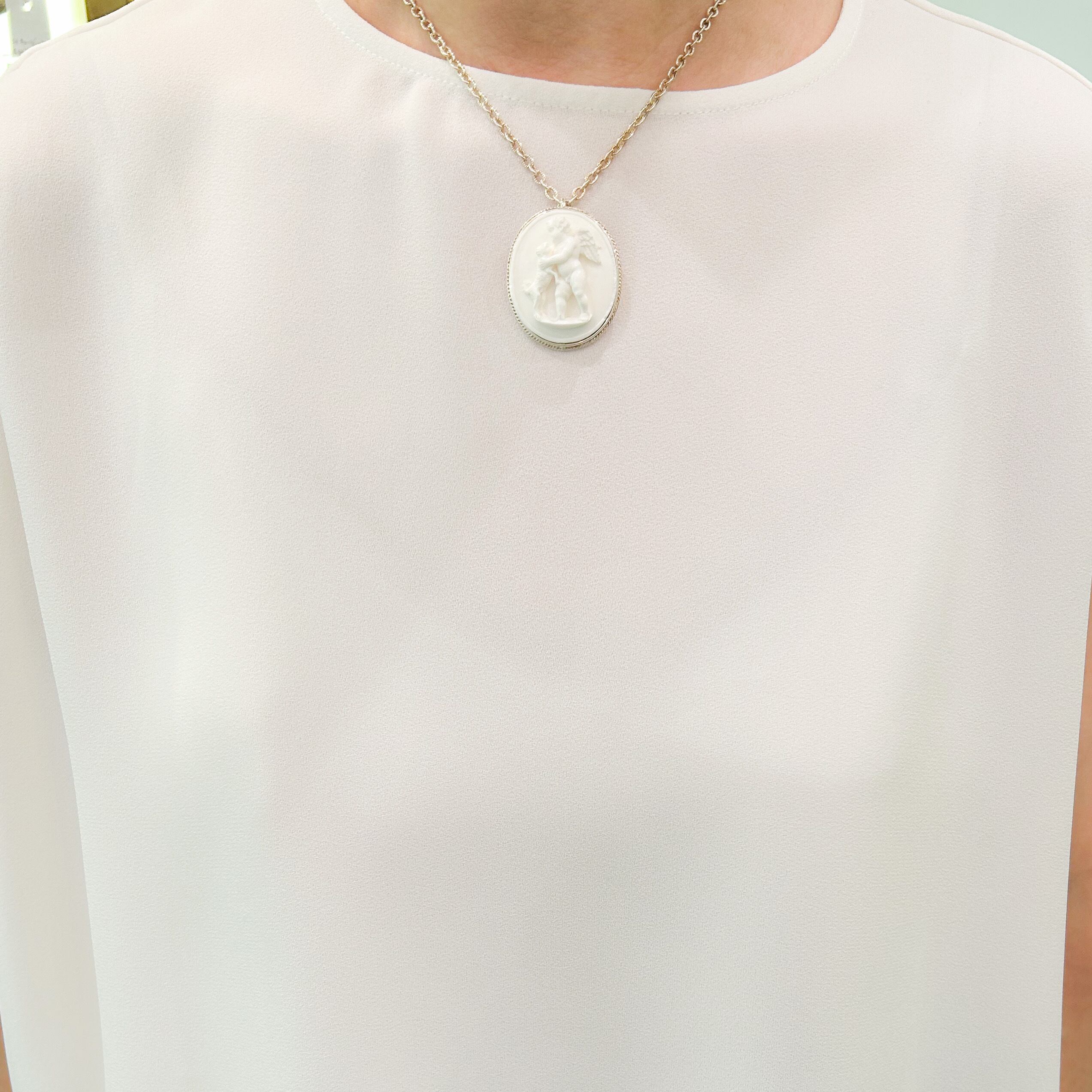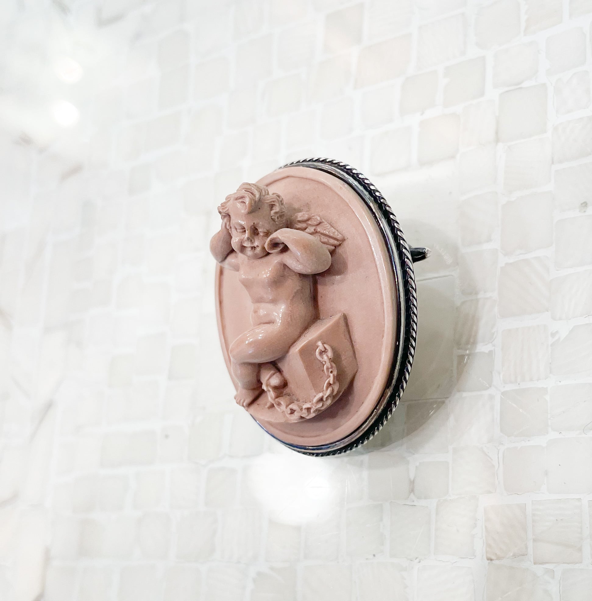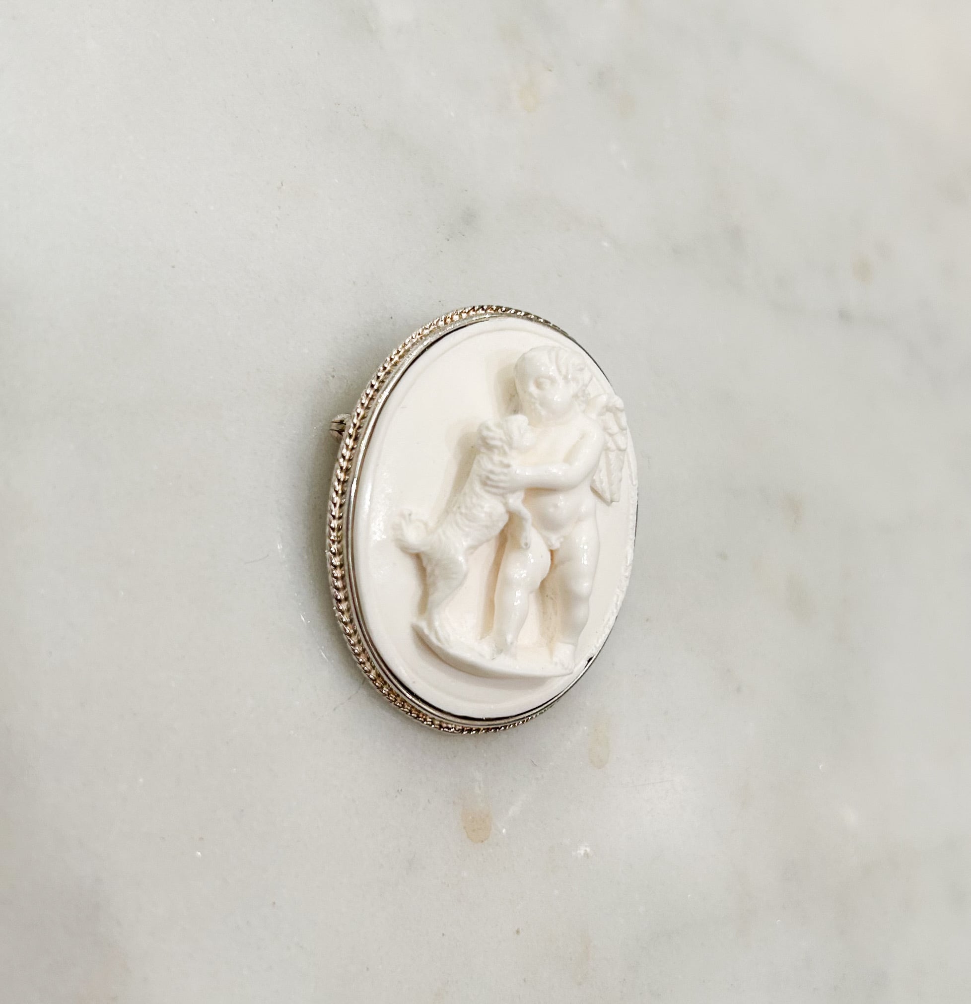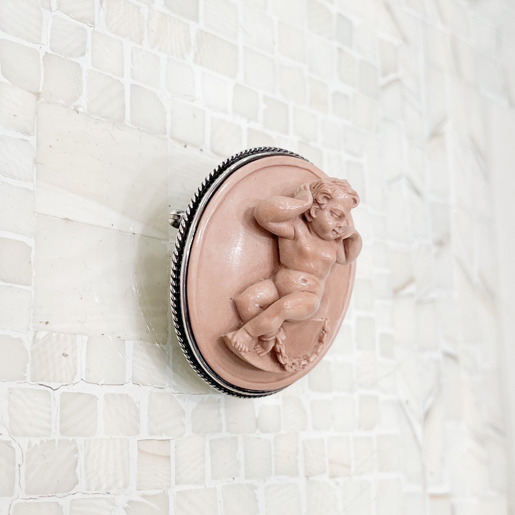 キューピッドのモチーフのニューラーヴァカメオシルバーペンダント兼ブローチ(チェーン別)
