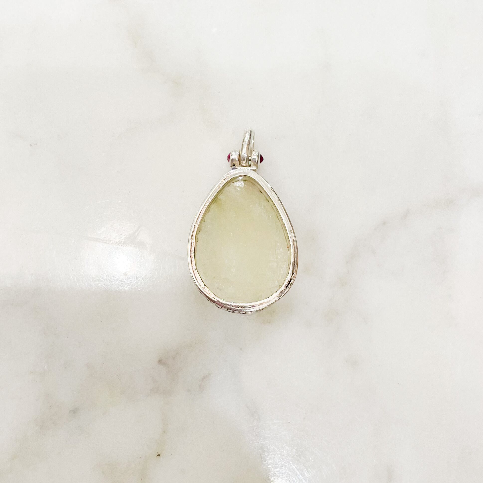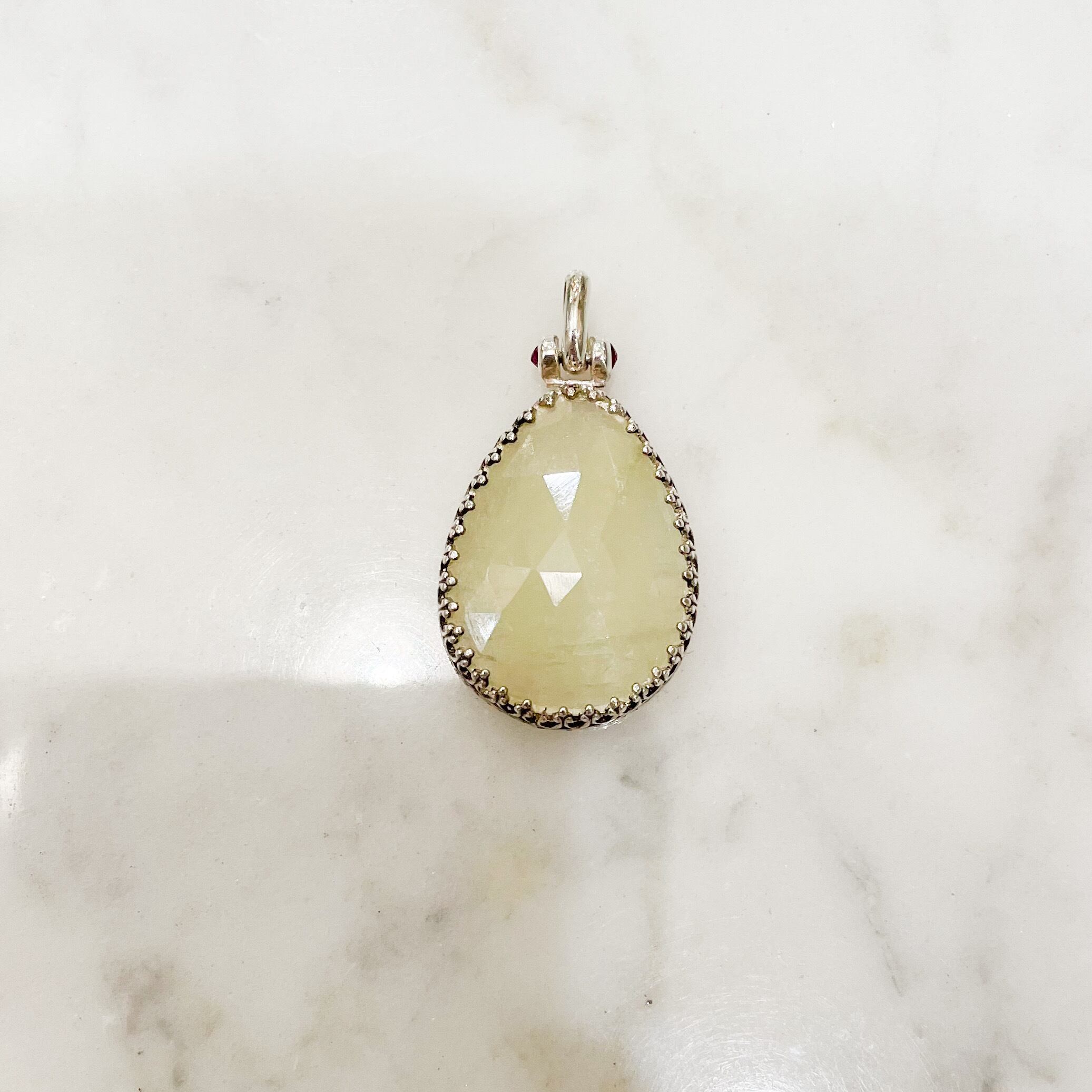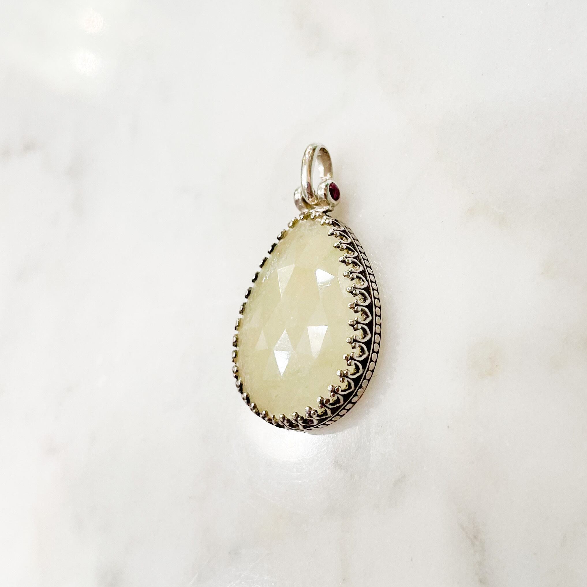 シルバーで王冠留めされたしずく型の白系のサファイア(11.07ct)にルビーのペンダント