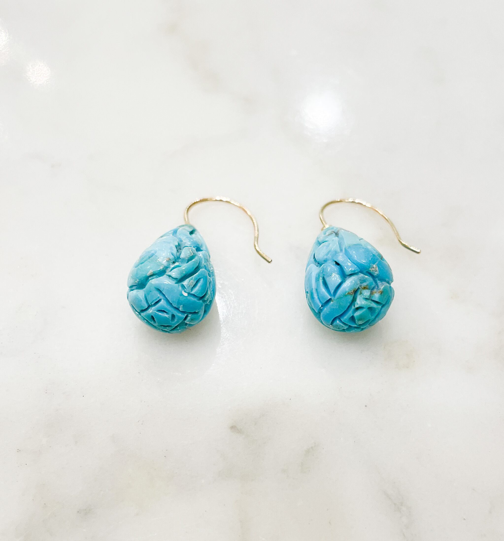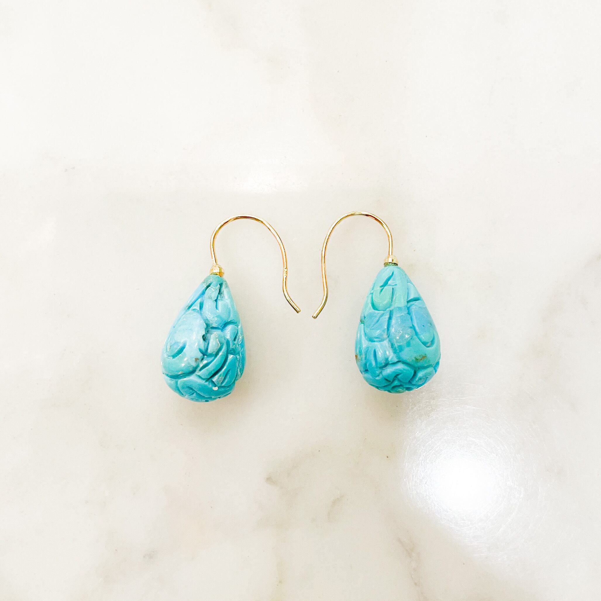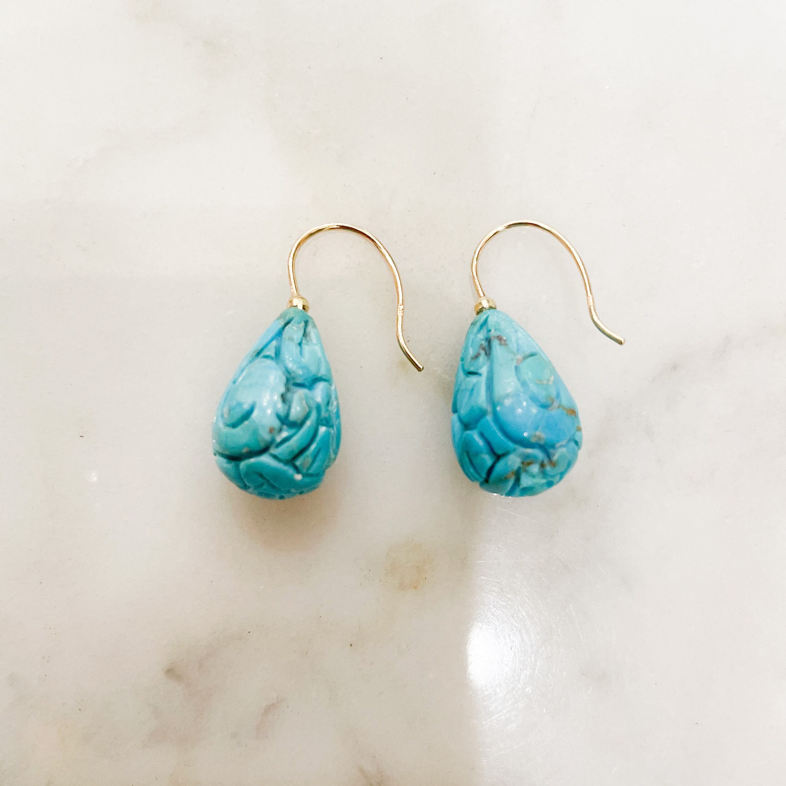 彫りの施されたしずく型のターコイズのフックピアス(10K)