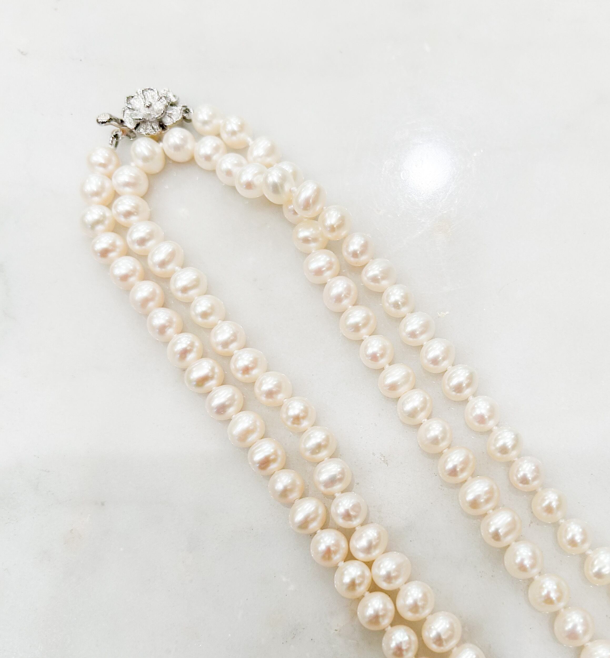 パールとパールの間一つ一つに結び目を入れて繋いでいるため、サラッと身体や首に沿うように付けることができます。