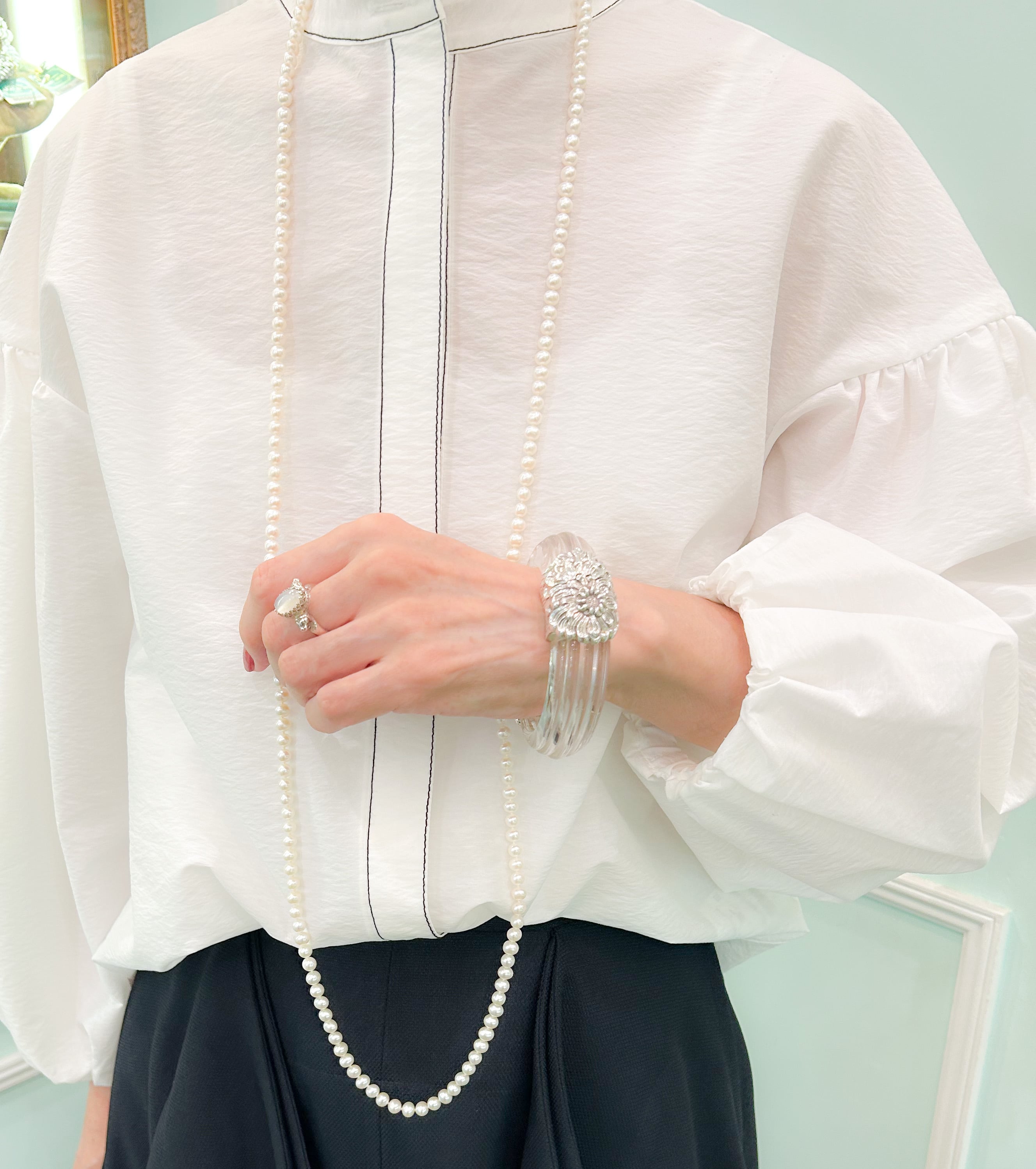 真珠の白は万能カラーなので、どんな色の装いにも合わせて楽しめます。