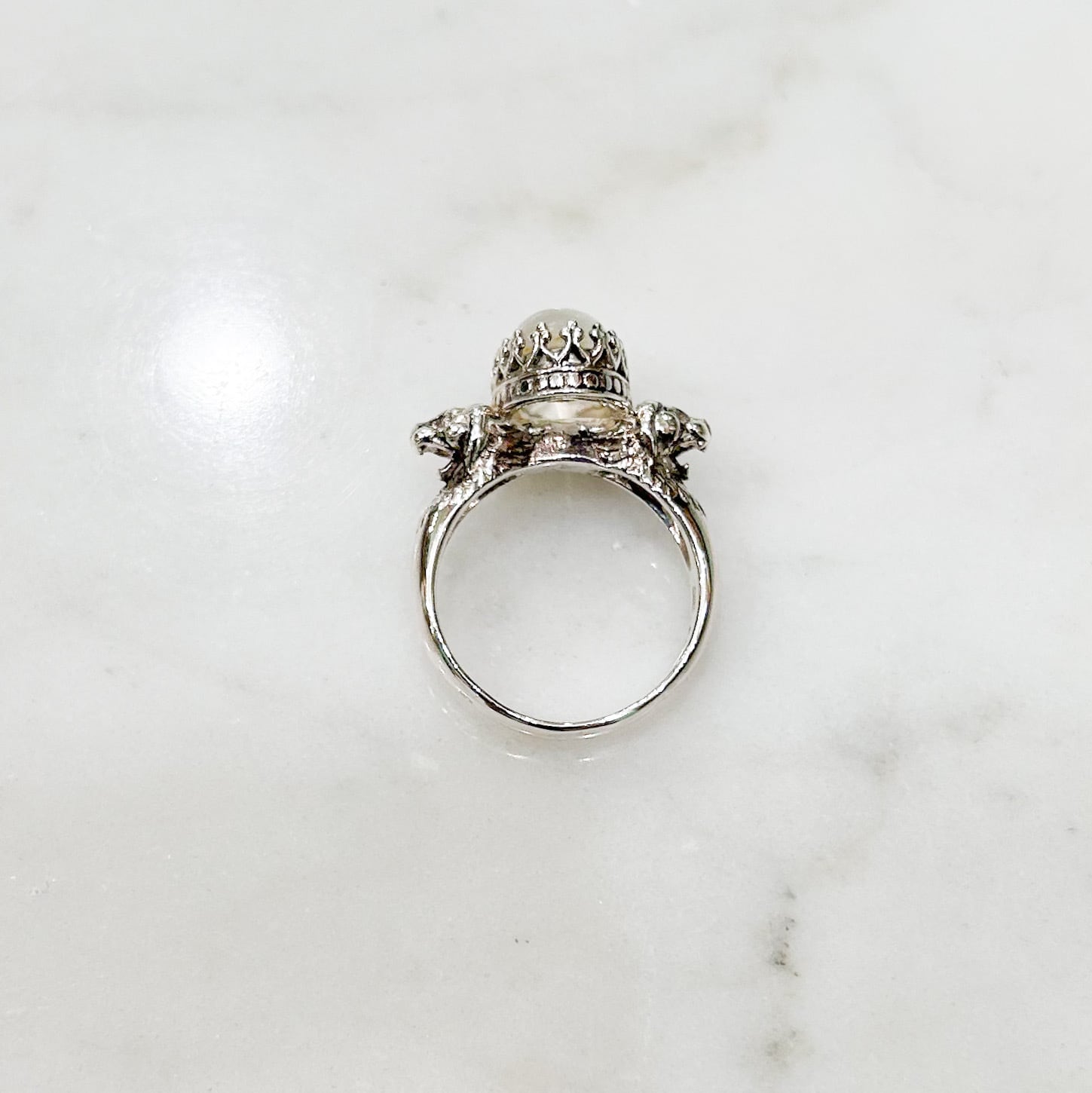 ふっくらとした曲線が美しいムーンストーンを縦使いにして、ティアラのような繊細な爪でグルリと取り巻き、二頭のライオンのモチーフがあしらわれているシルバー台にセッティング。リングの外側に向かって吠えているようなライオンの顔。