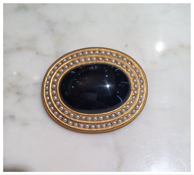 黒の樹脂に金彩、パールがグルリと巻いているブローチ