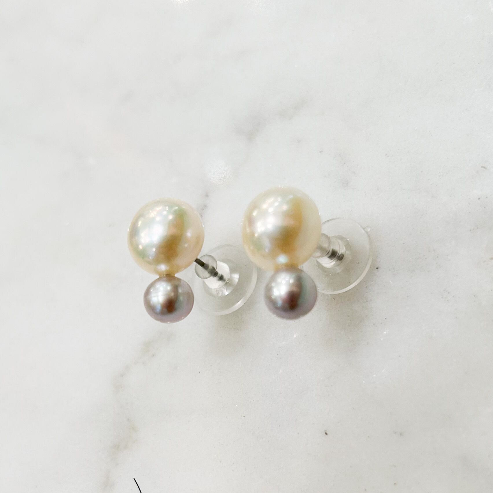 ペタンとした形の白い真珠と丸いグレーパールを、重ねたようなピアス(チタンポスト)