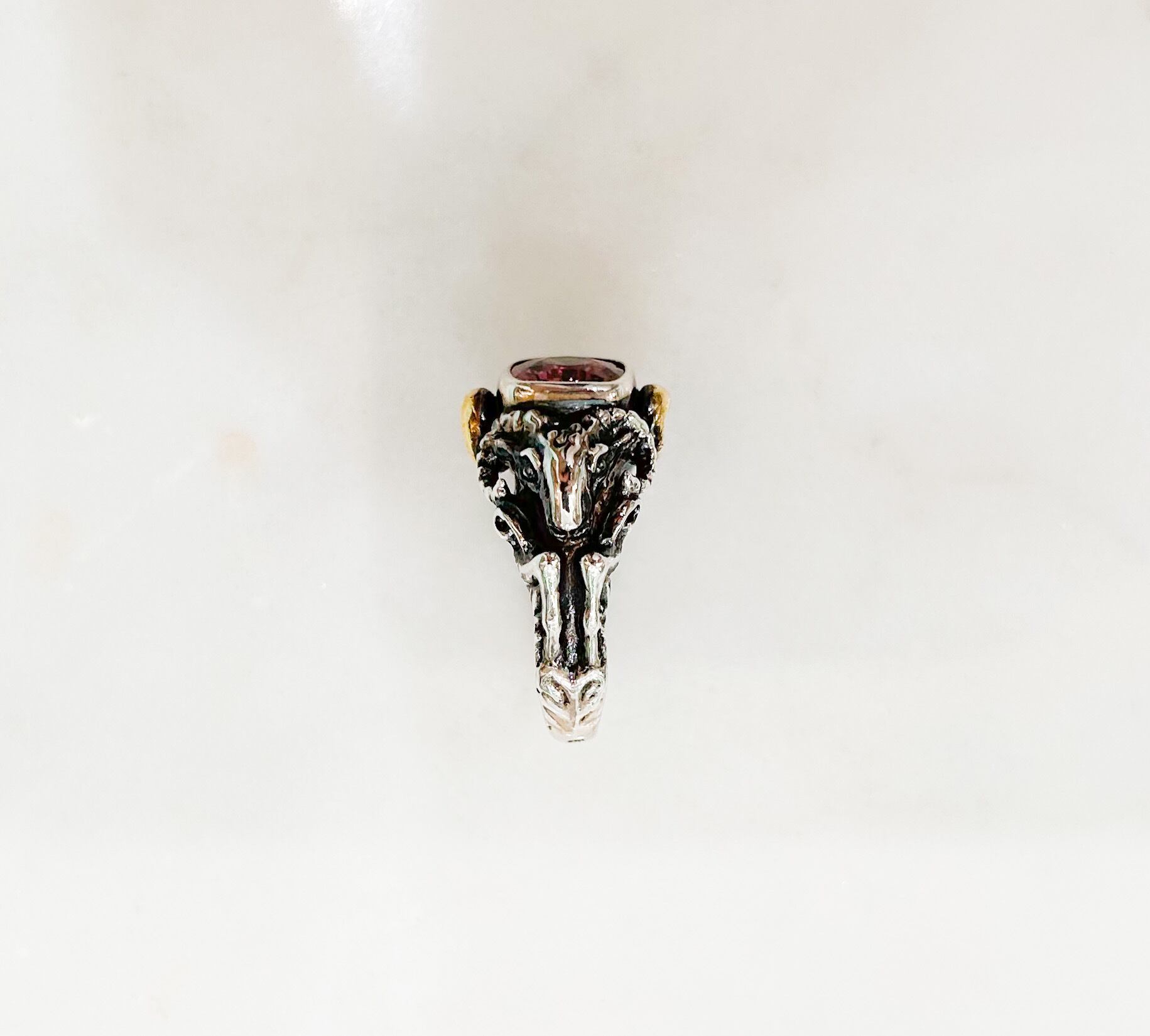 こちらはピンクスピネルをセットした銀の山羊リングです。