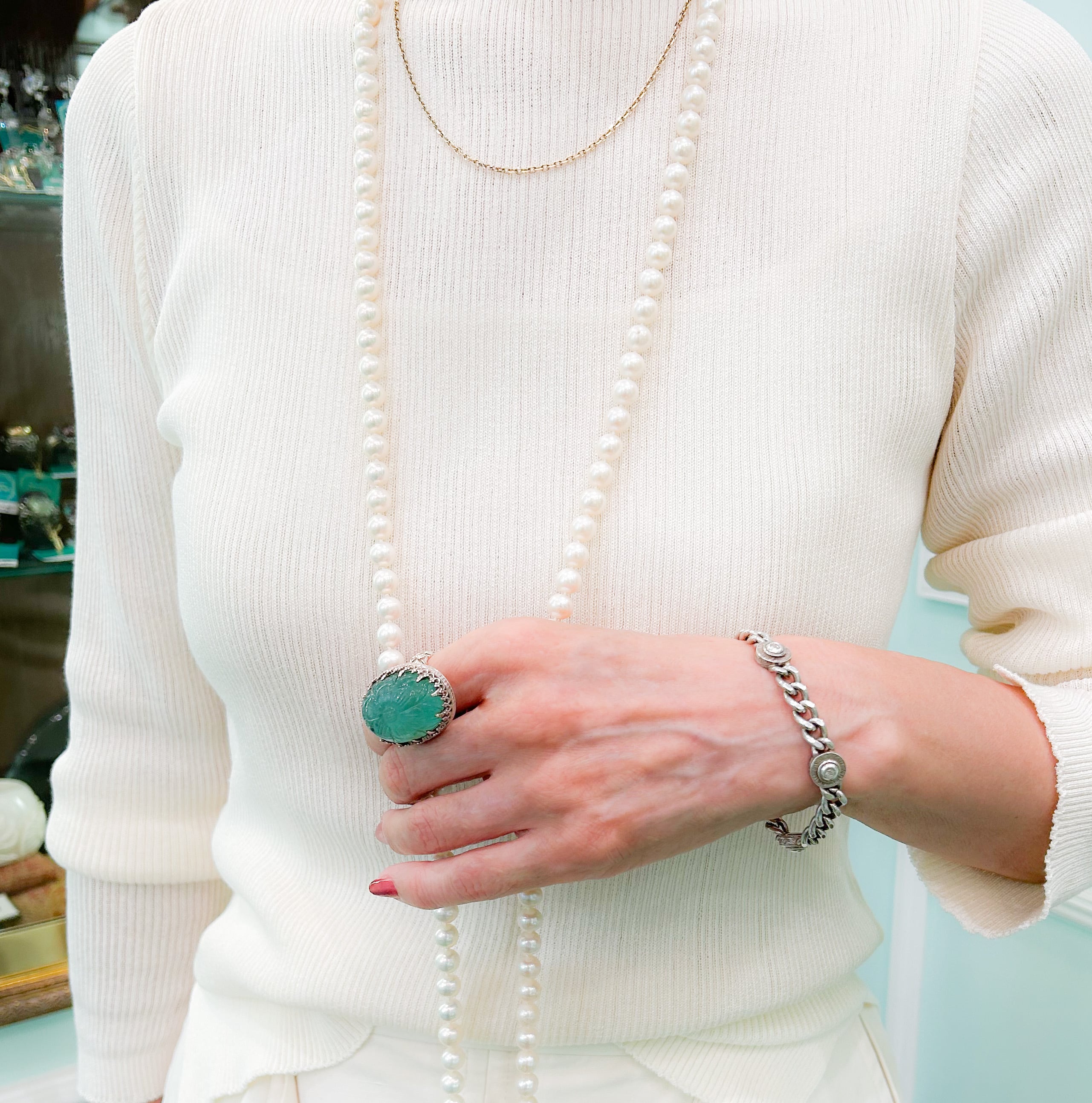 とてもボリュームがあるので指に載せた時もグッと目立つのですが、石の色が優しく柔らかなので合わせやすいかと思います。
