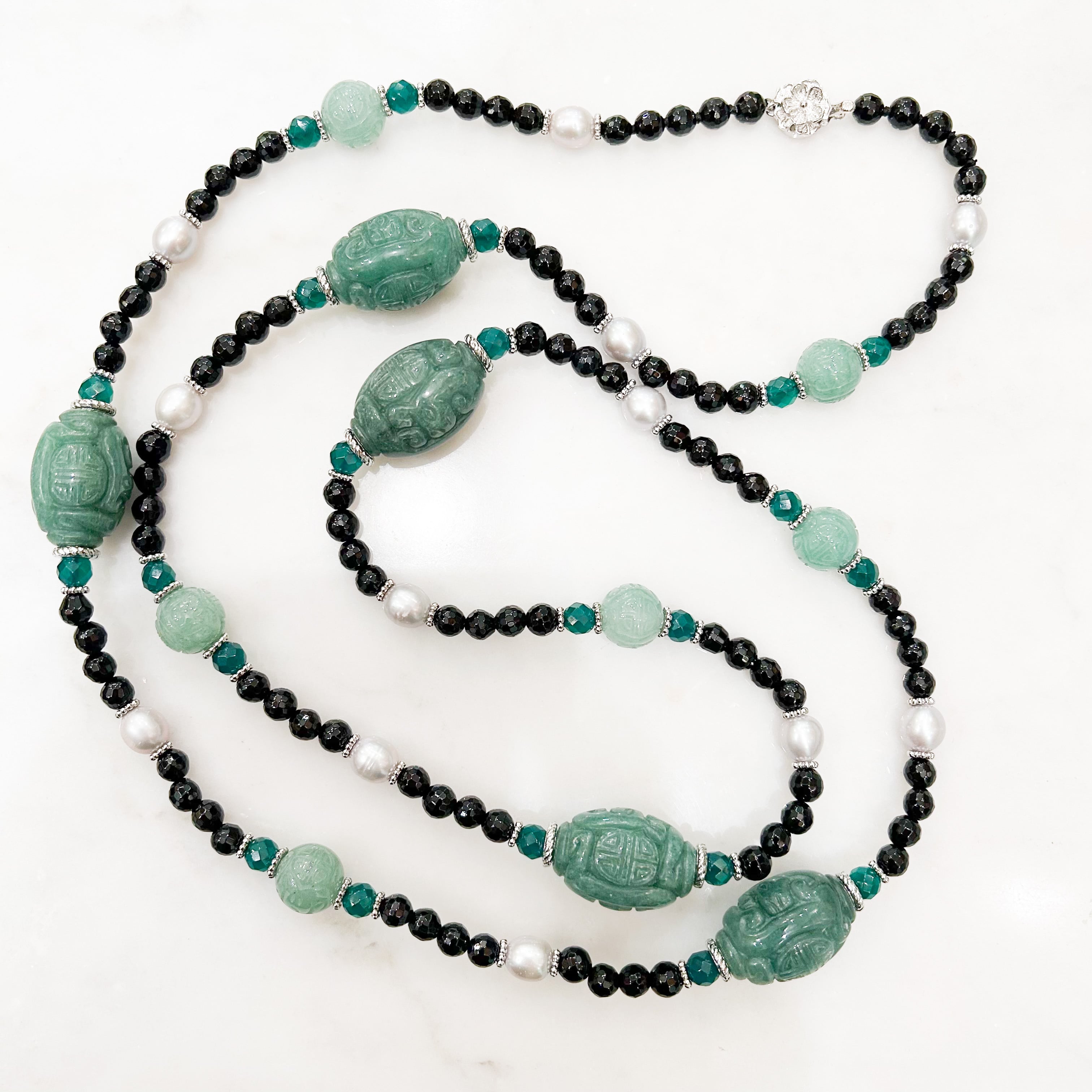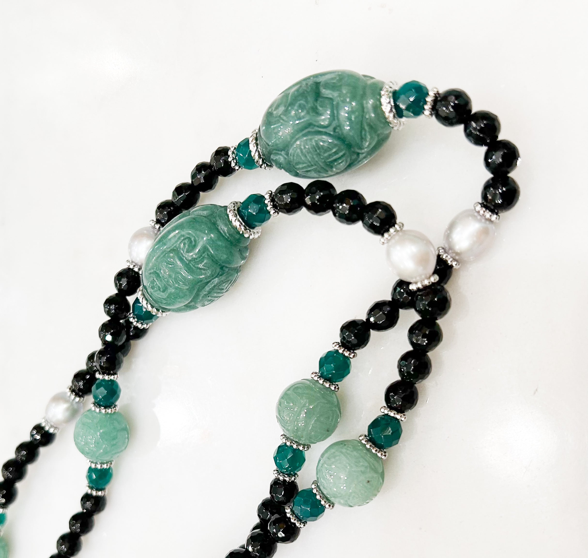 カットが施されてキラキラと輝くオニキスをベースにして、オリエンタルな彫りが施された緑色のアベンチュリン、とグリーン瑪瑙、そしてグレーパールと金属だけのロンデルを繋ぎました。