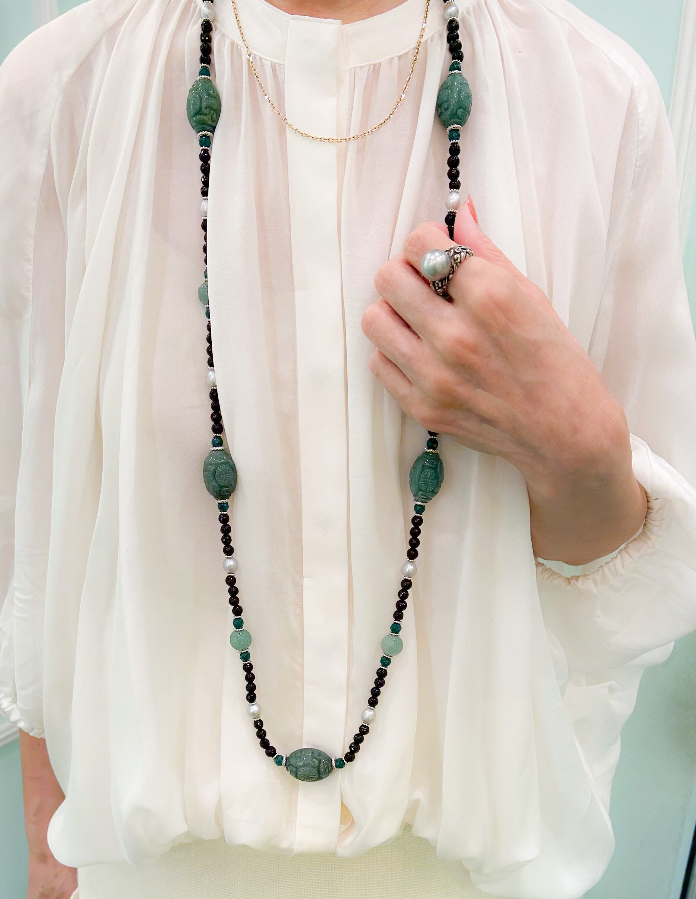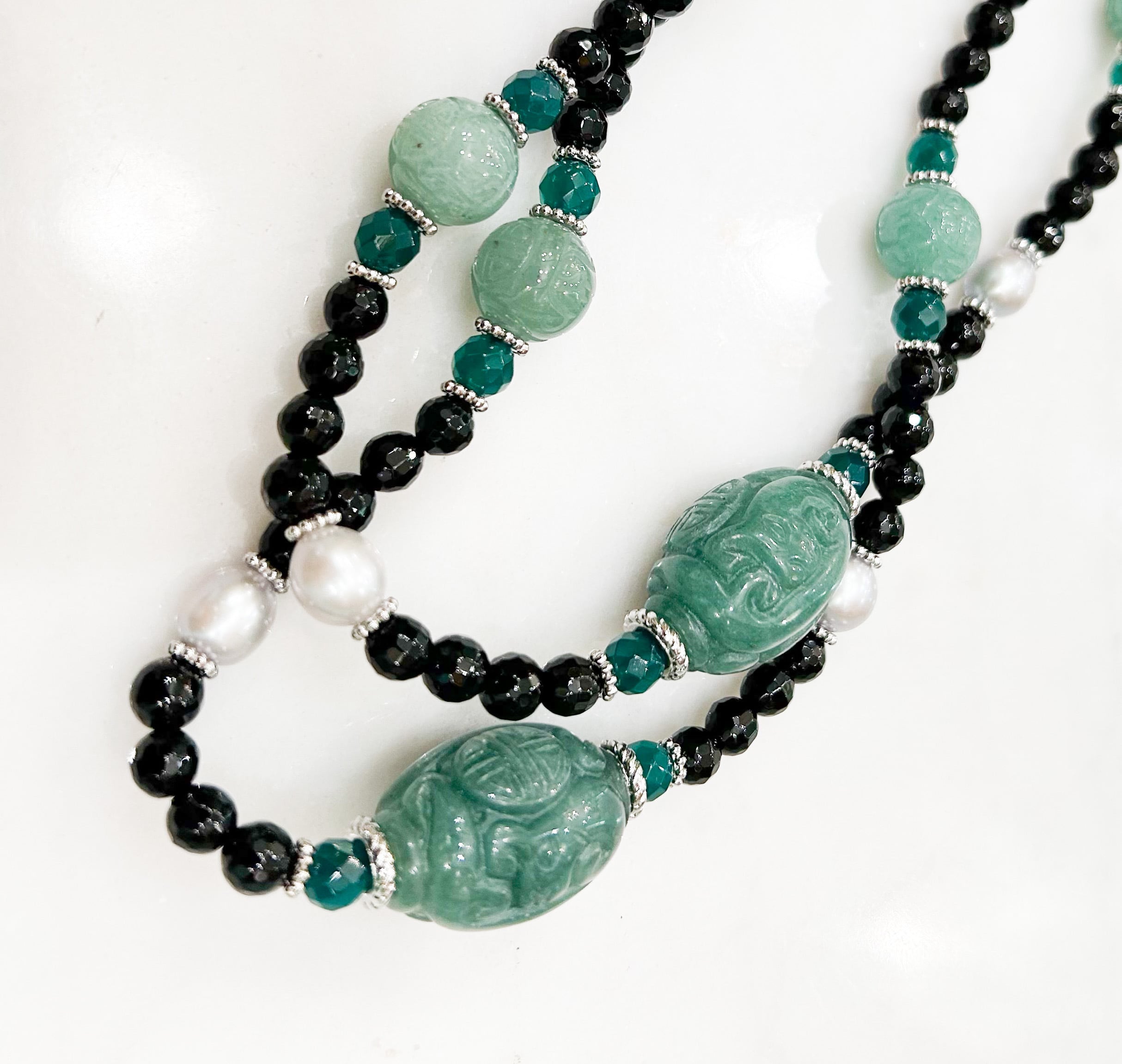 オニキスにグレーパール、グリーンアゲート、ロンデルに彫り入りのアベンチュリンのロングネックレス