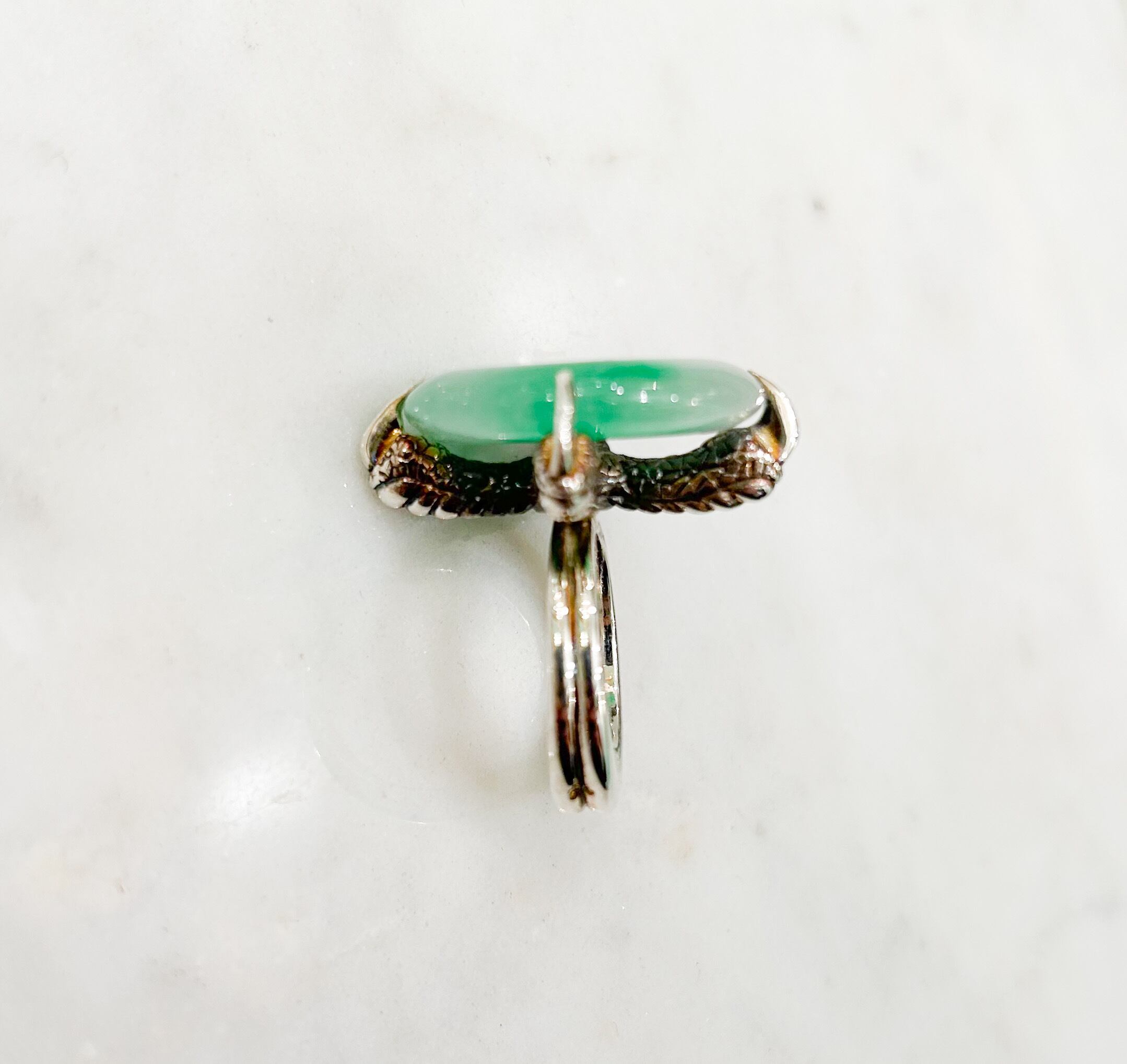 真ん中に穴の空いたまん丸のギョクを使ったシルバーリングは、4本のシルバーの鷹の爪で台にセットされていて、龍が宝玉を持っているようなデザインになっています。