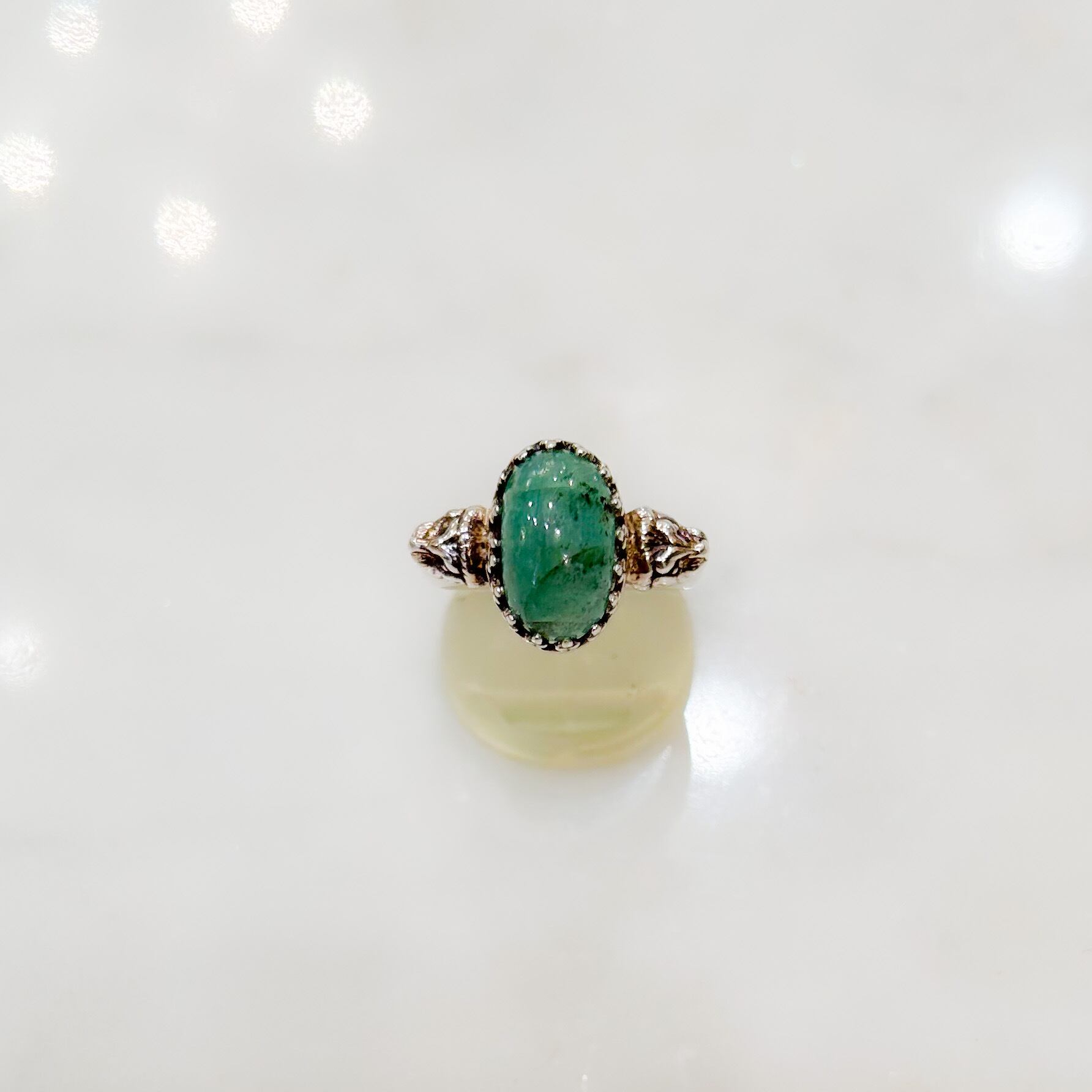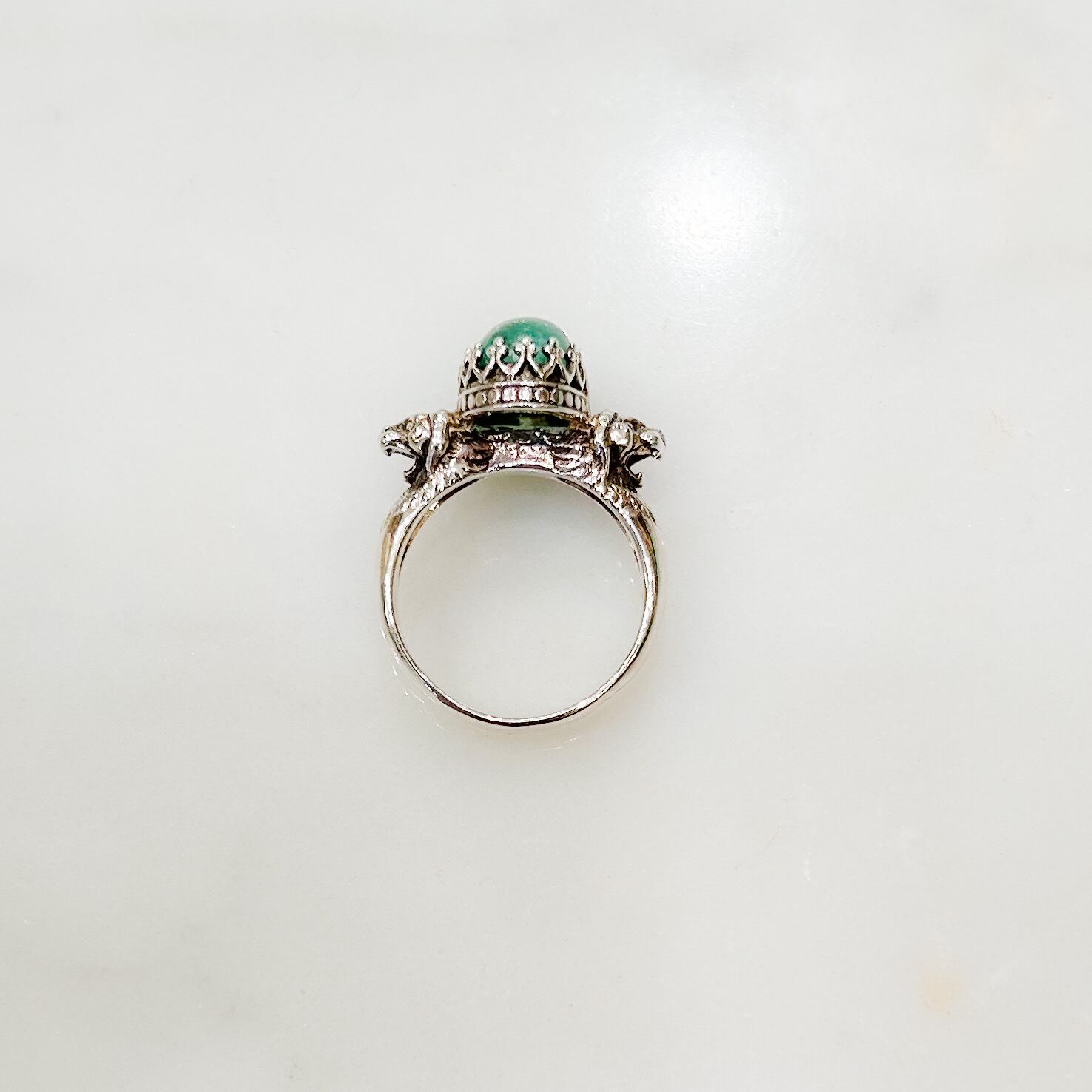 でも、このシルバーで作られた不思議なデザインのライオンリングには、この深い味わいのあるエメラルドの雰囲気がピッタリ!