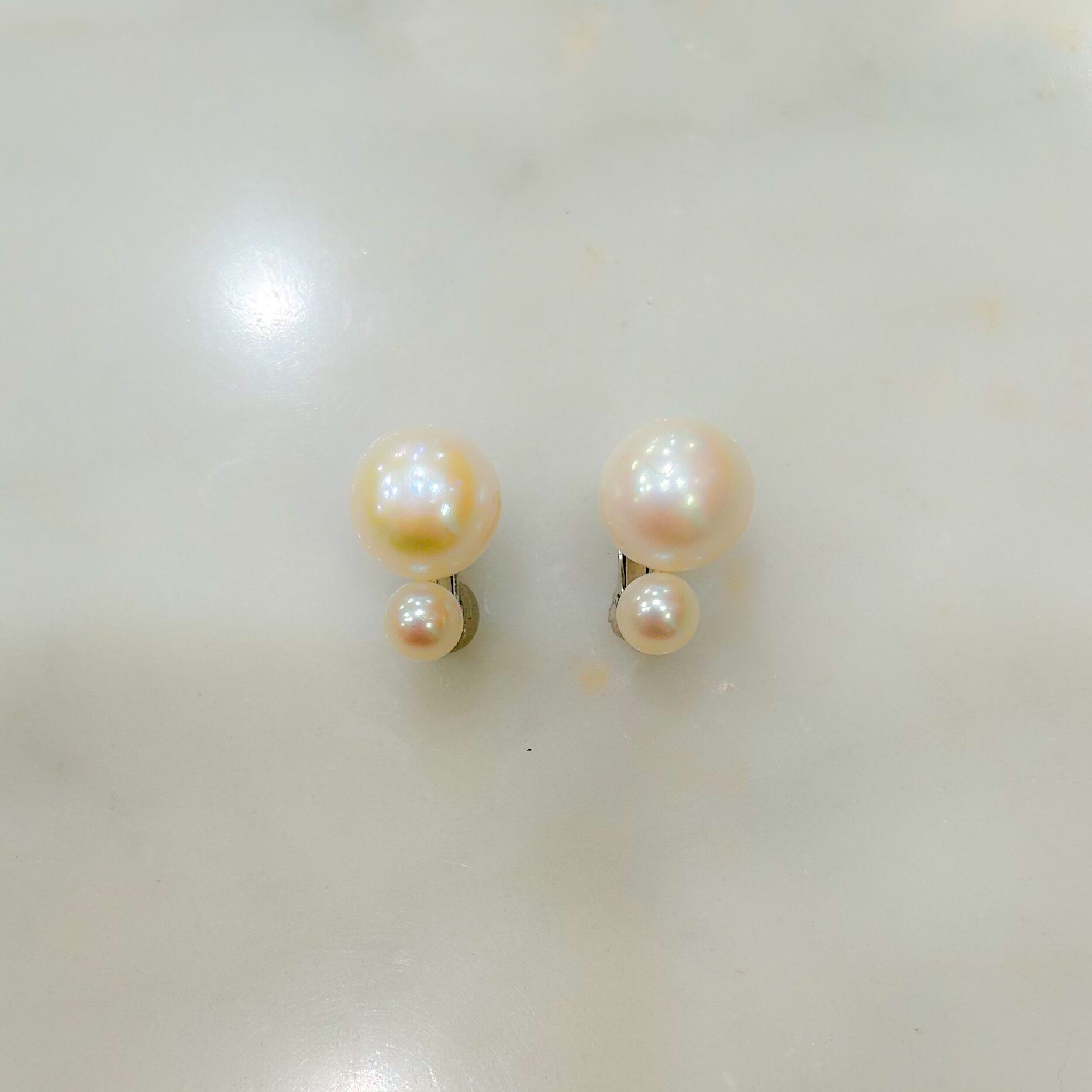 ペタンとした形の真珠(12mmアップ)と丸い真珠(6mmアップ)を重ねたようなイヤリング