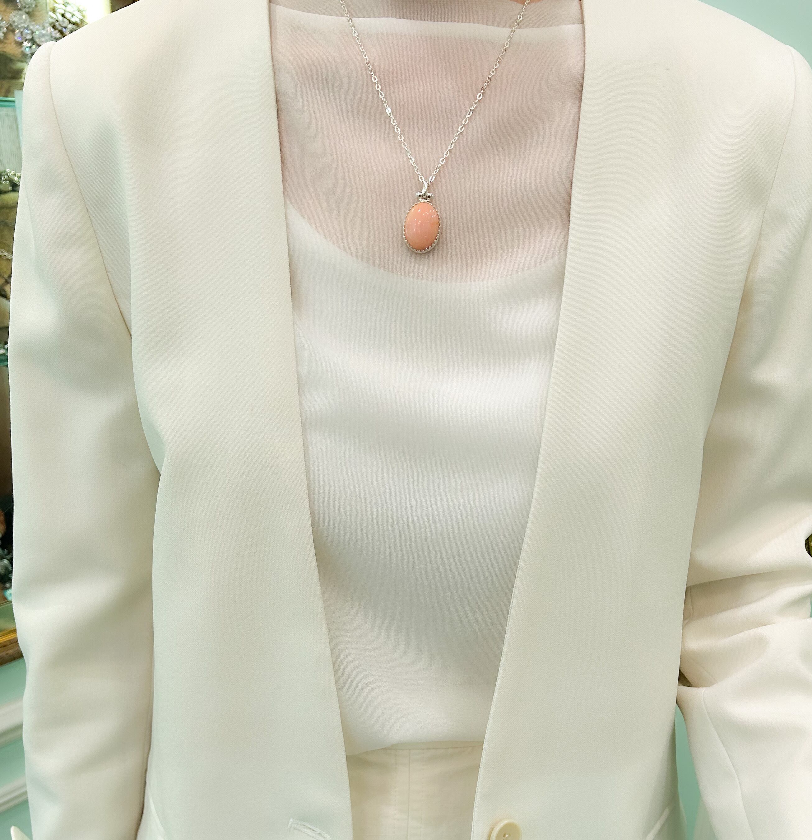 合わせやすい色なので、一年を通して様々な装いに使えるペンダントです。