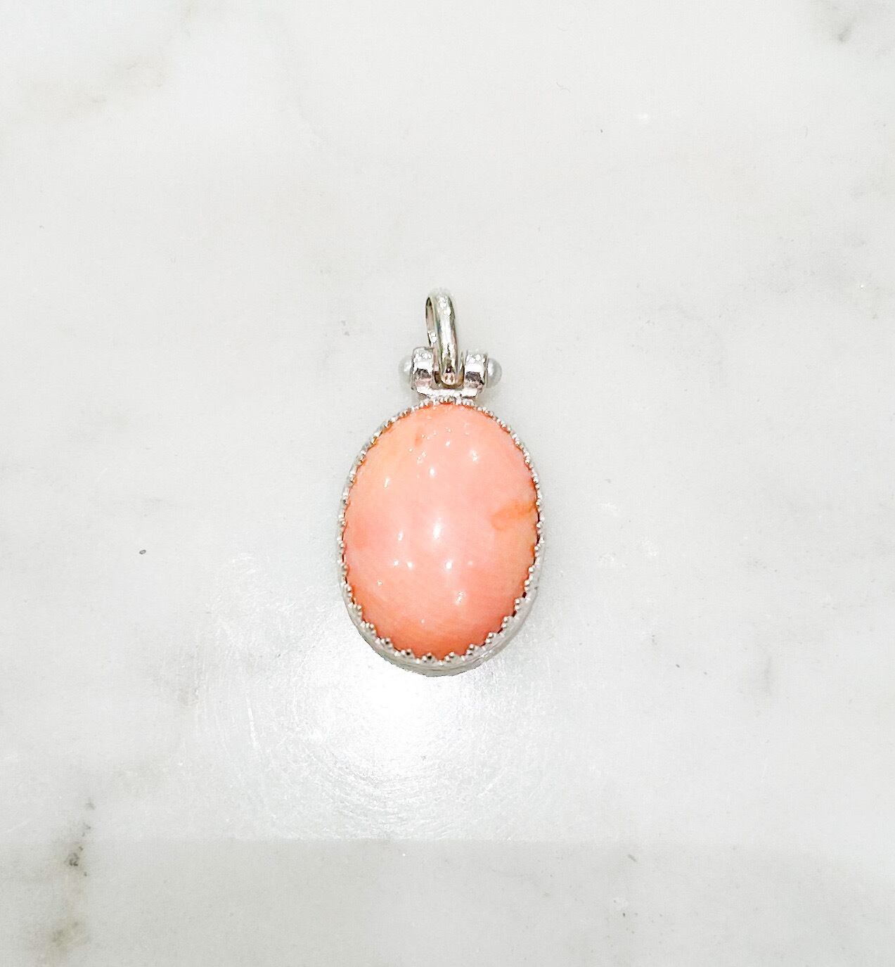 ティアラのような爪がやわらかなトーンのピンクの珊瑚をグルリと取り囲み、その爪自体が装飾になってくれています。