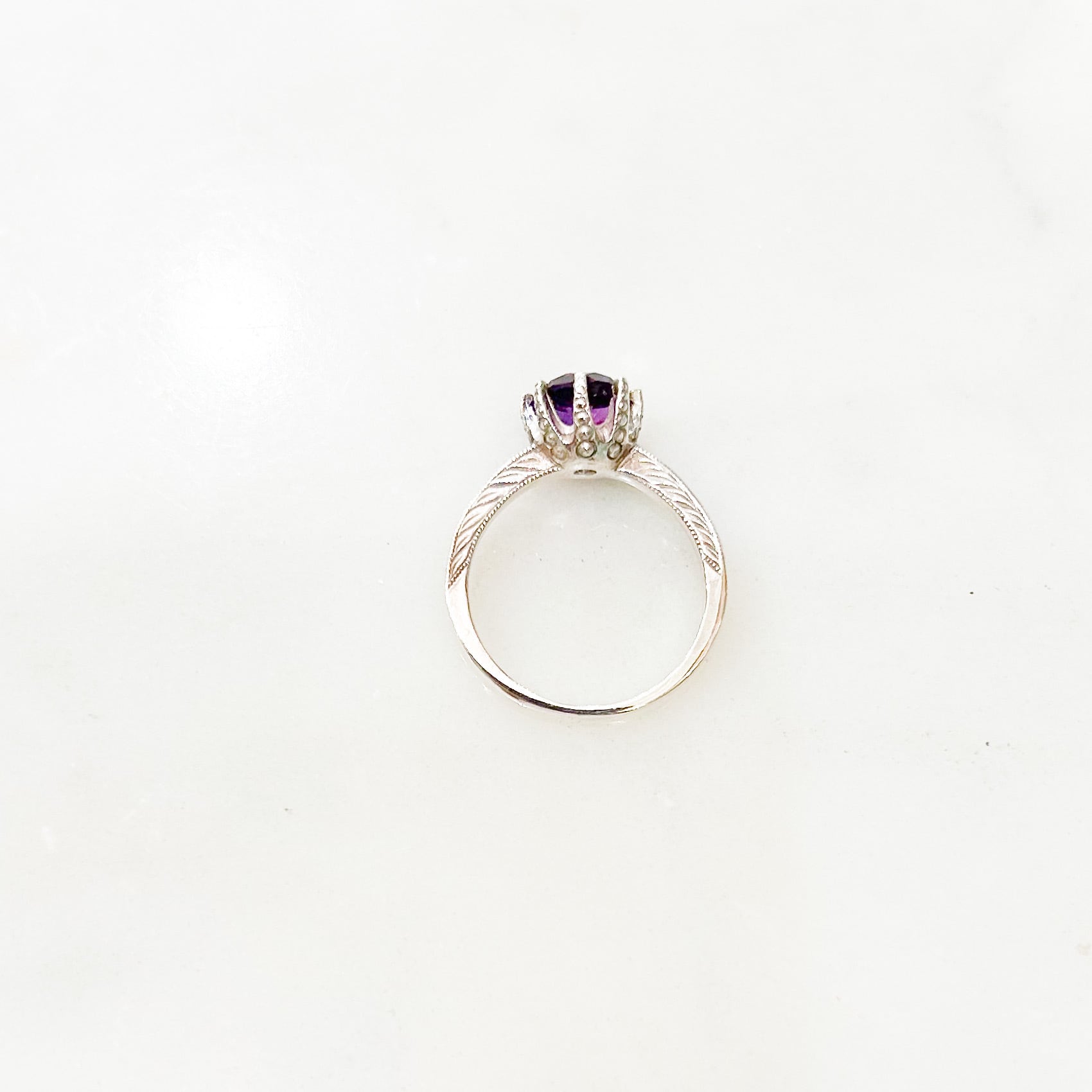 8本の爪でアメジストを留めた彫りの施された細い腕のシルバーリング