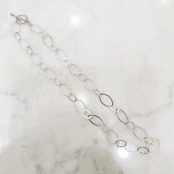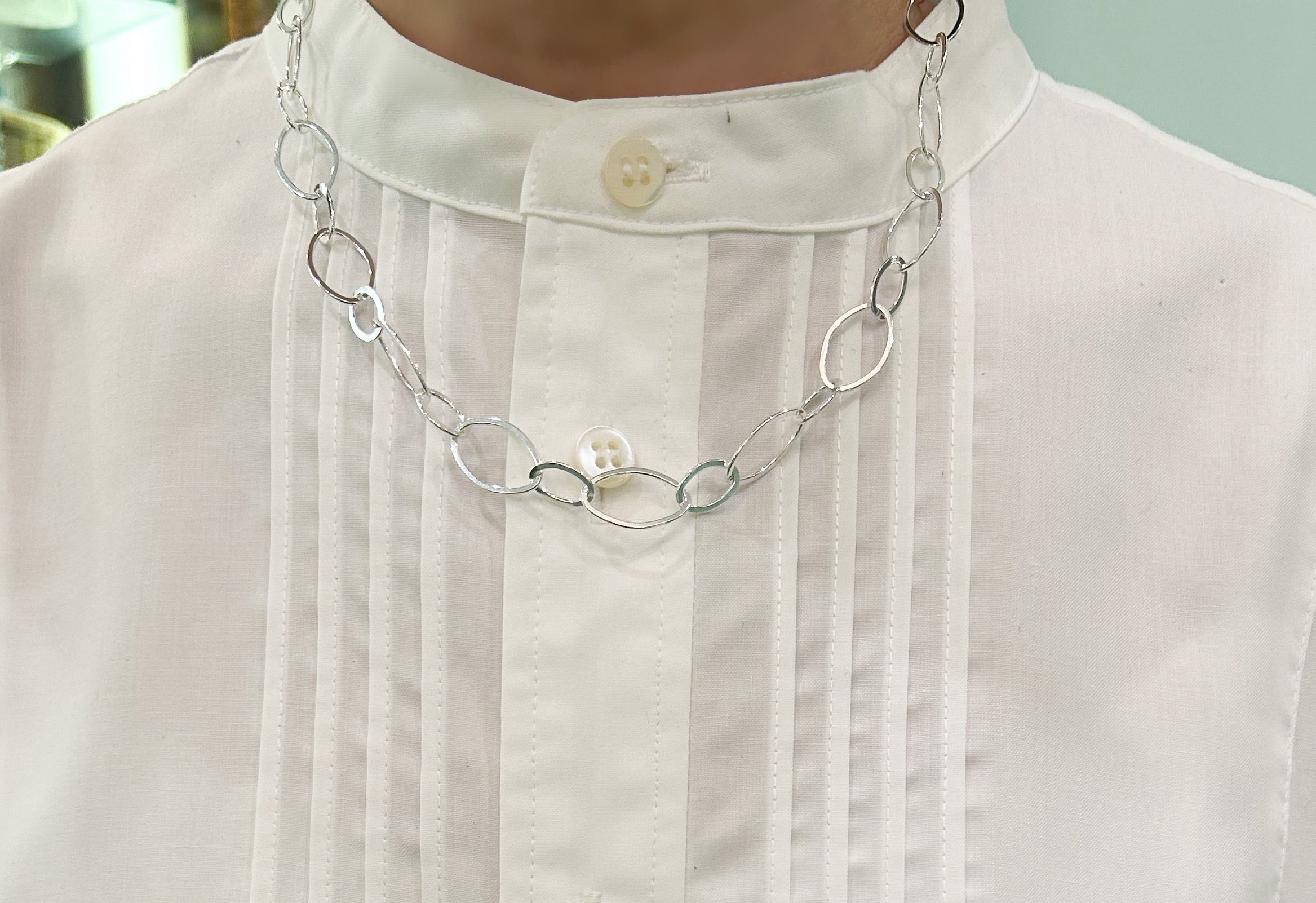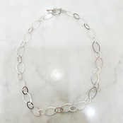 縦長のラグビーボールのような形の大小2つの大きさのシルバーの輪をつないだチェーンに、最近人気の留め具、マンテルを付けたシンプルなネックレスです。