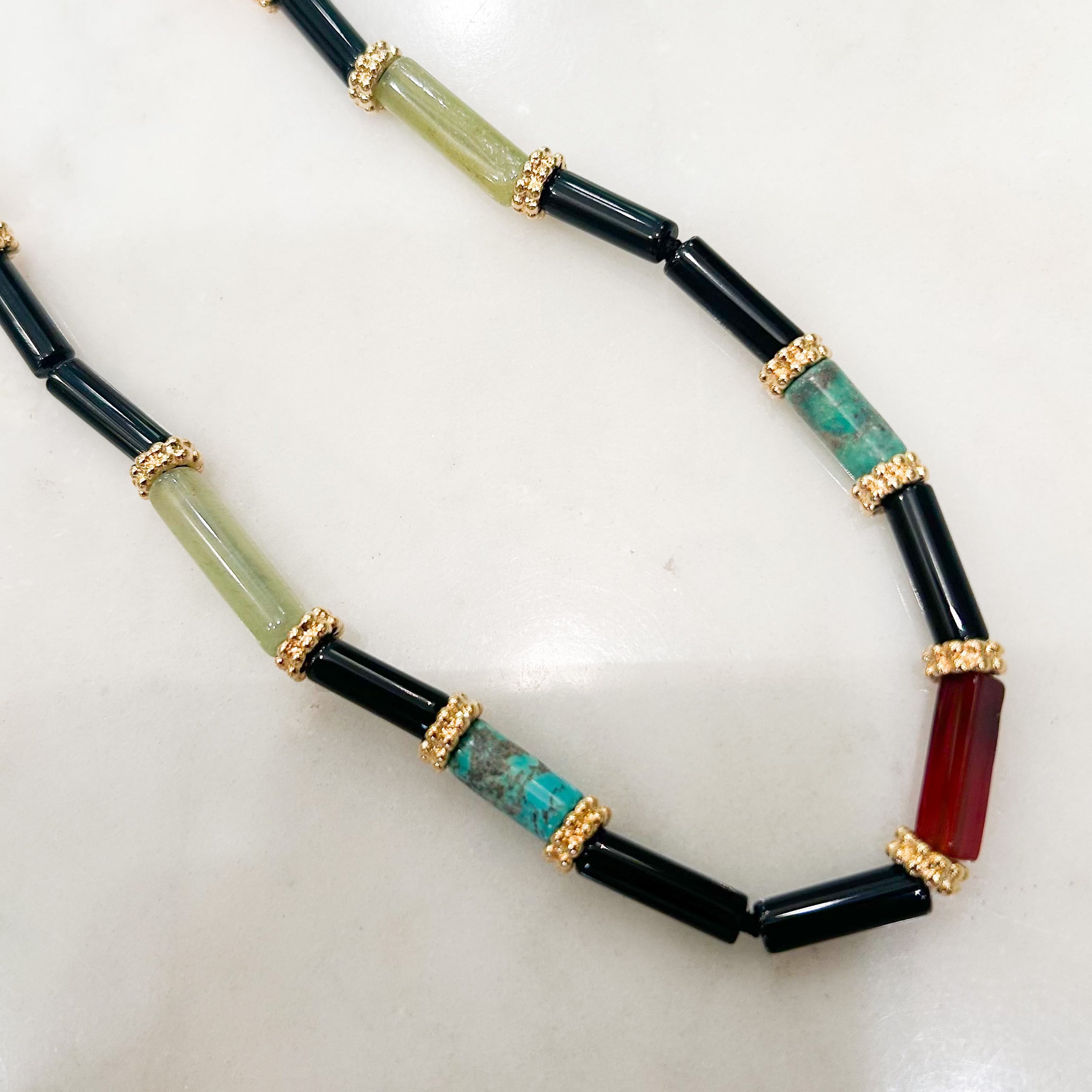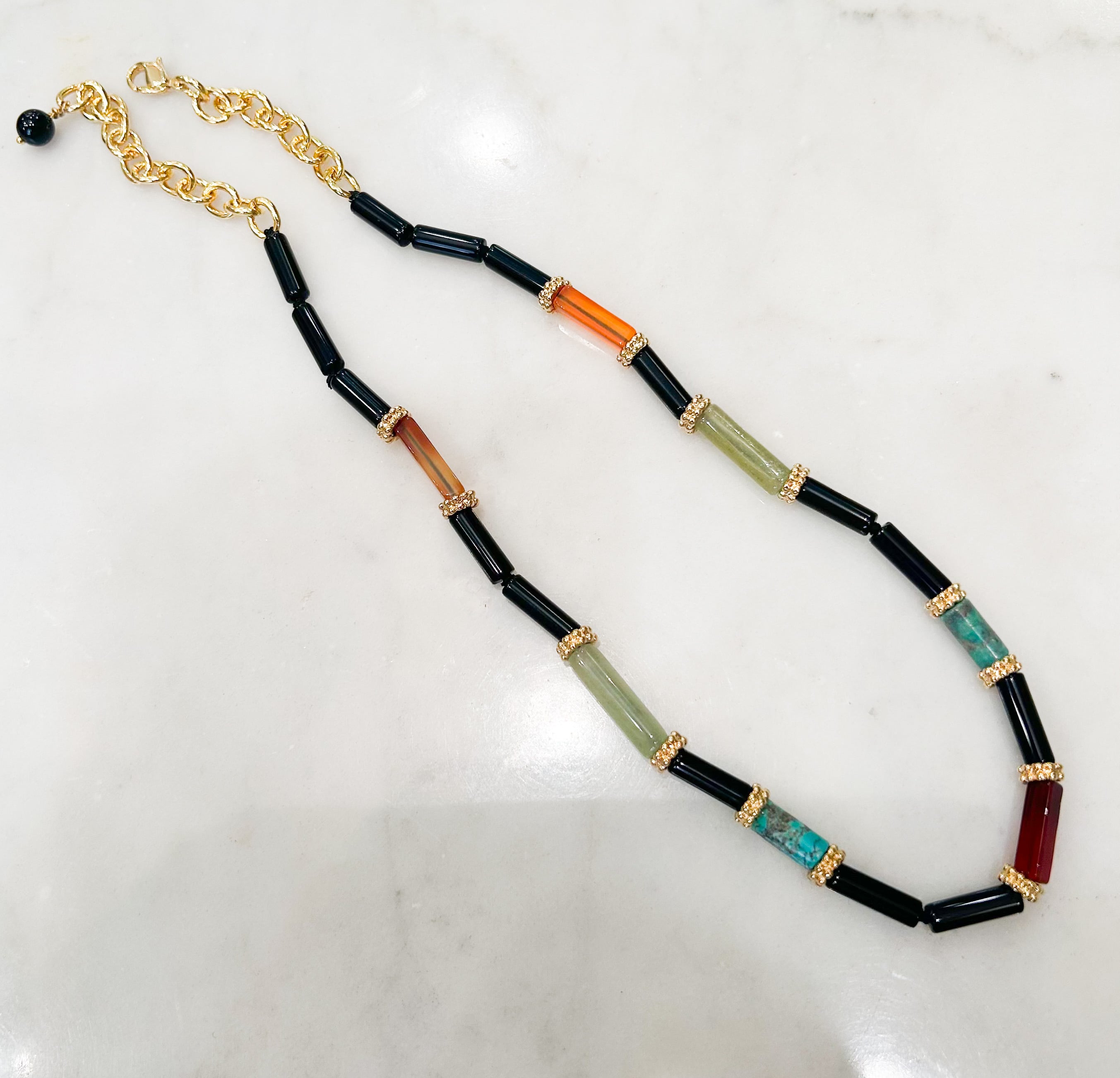 細長い管のようになっている天然石を繋いで、チェーンに繋いで、金色のパーツをアクセントにプラスしたシンプルなネックレスです。