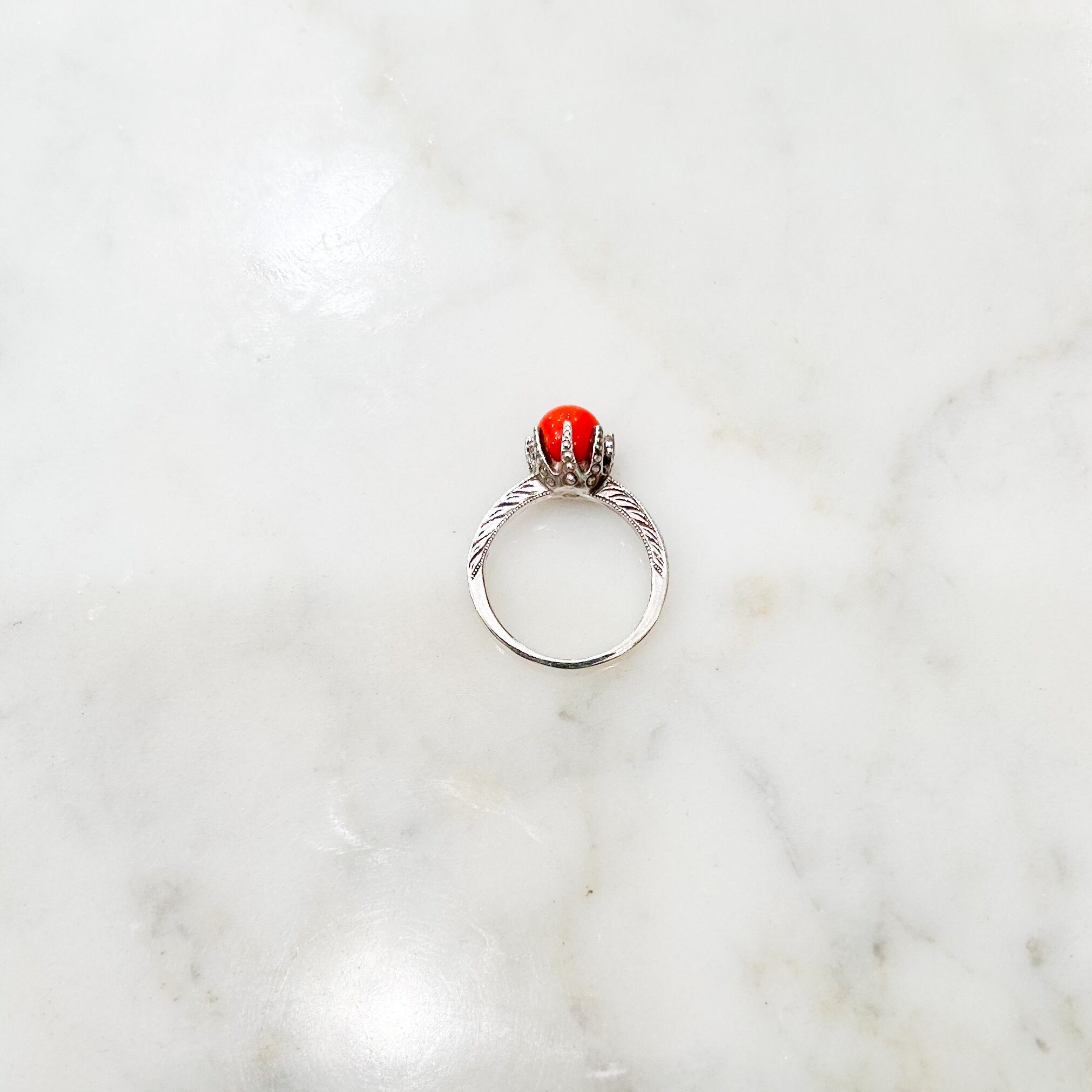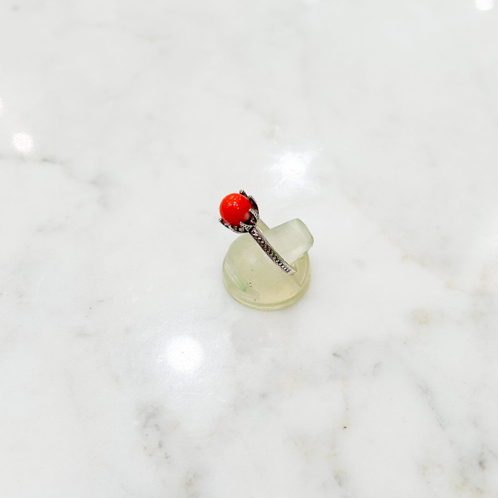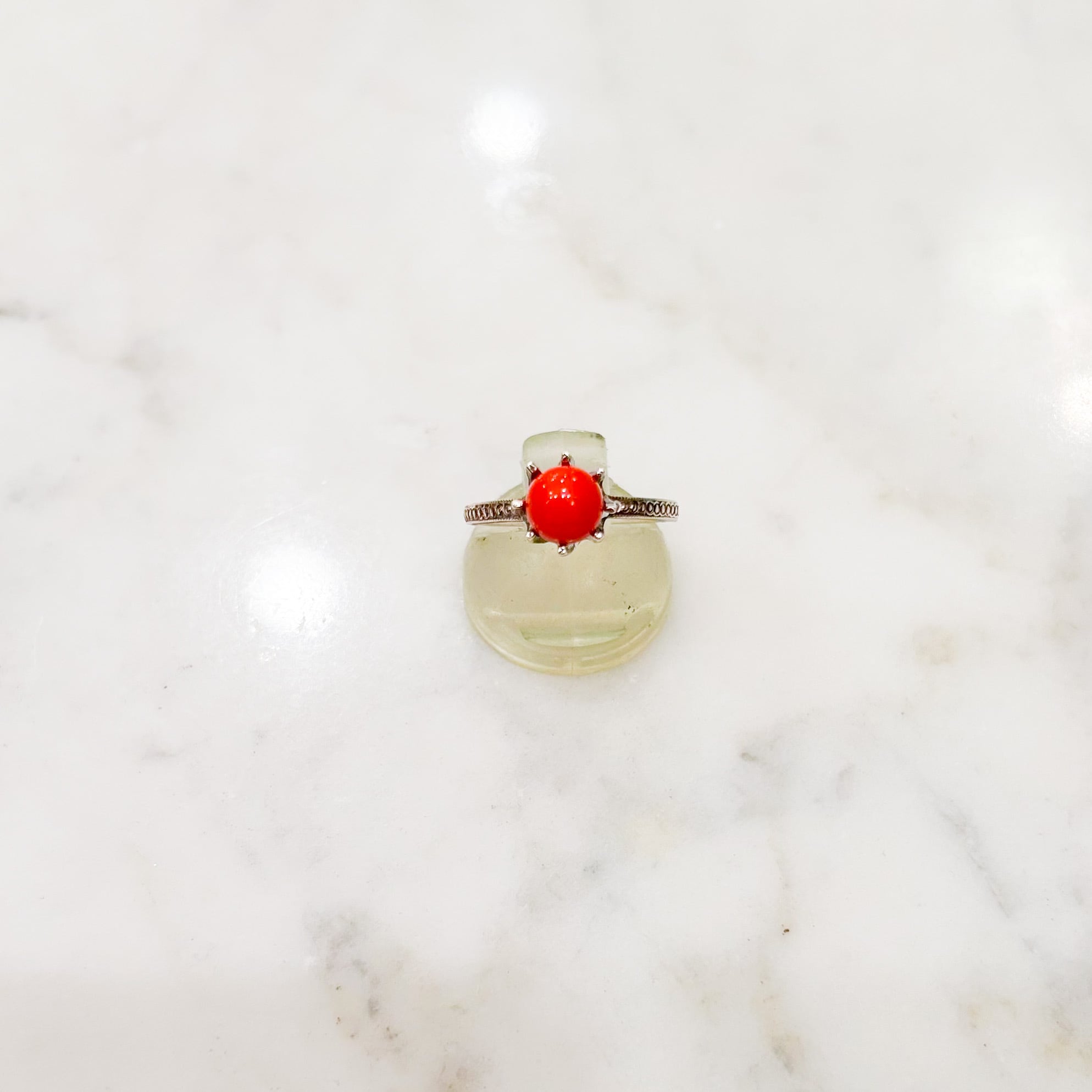 直径が6mmの胡渡珊瑚を8本のシルバーの爪でセンターに留めた、少しクラシカルなデザインのシルバーリングです。