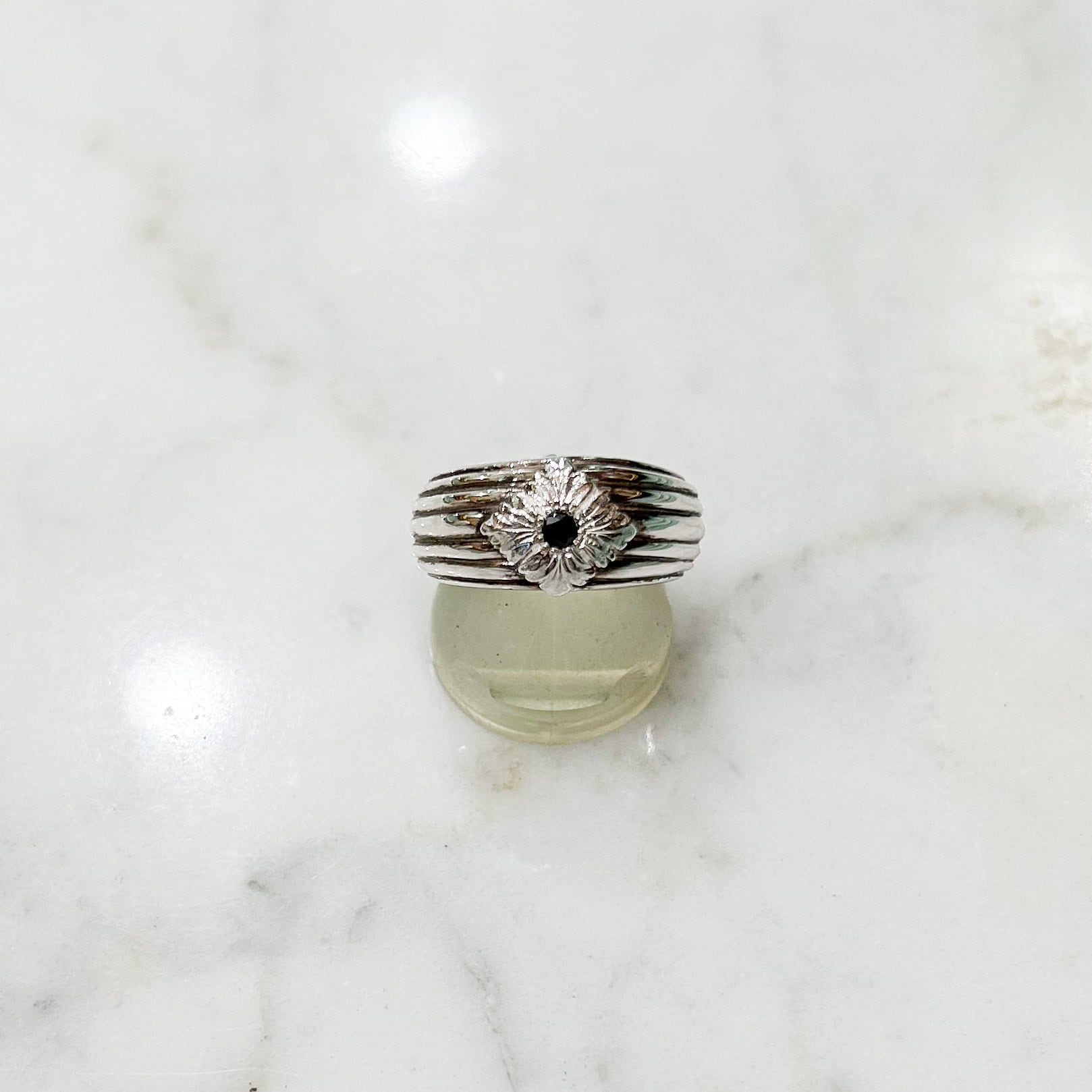 そのシンプルな直線と曲線で構成されたシルバーのベースリングの上にセットしているのは、繊細な羽や花ような彫りの菱形のパーツ。