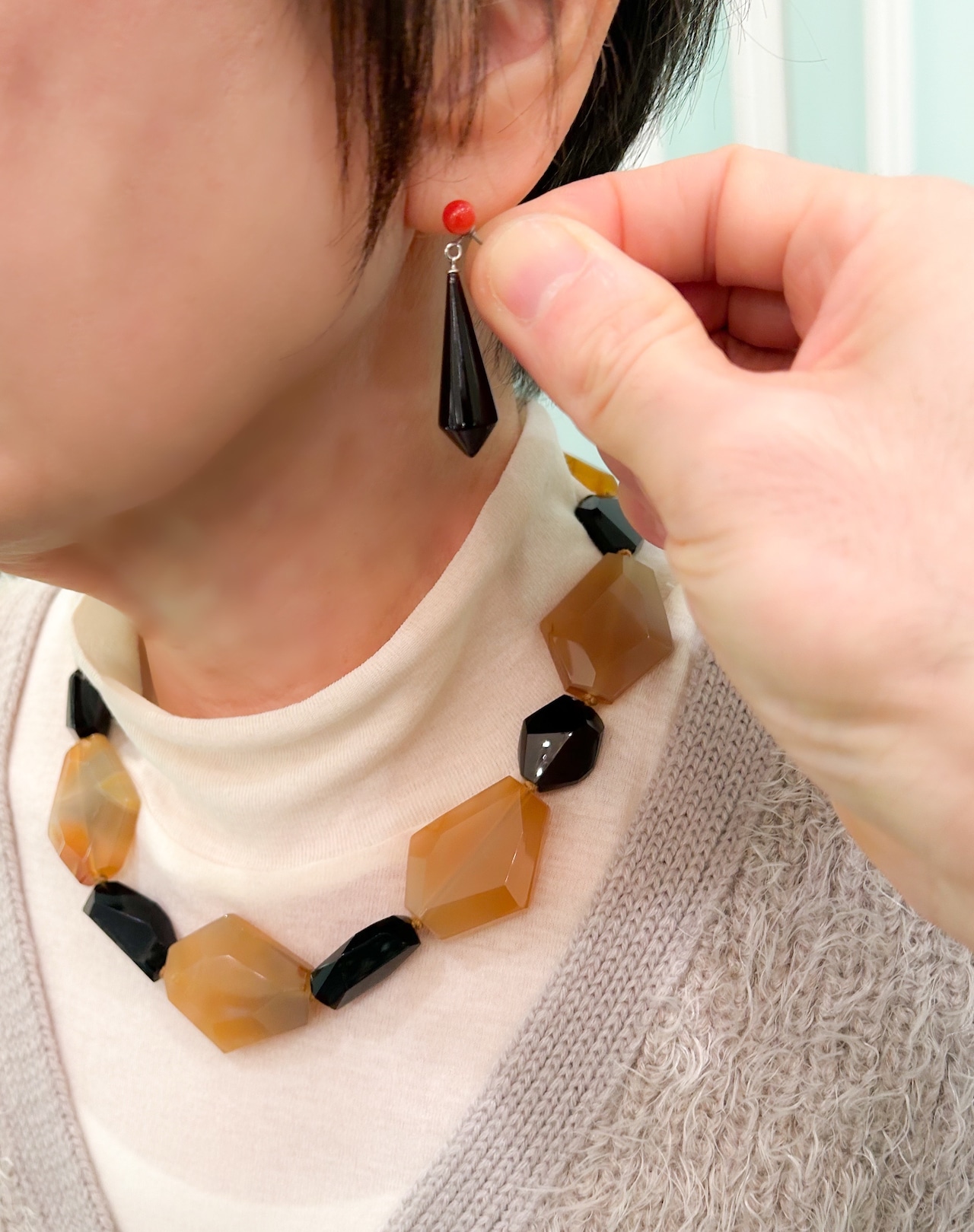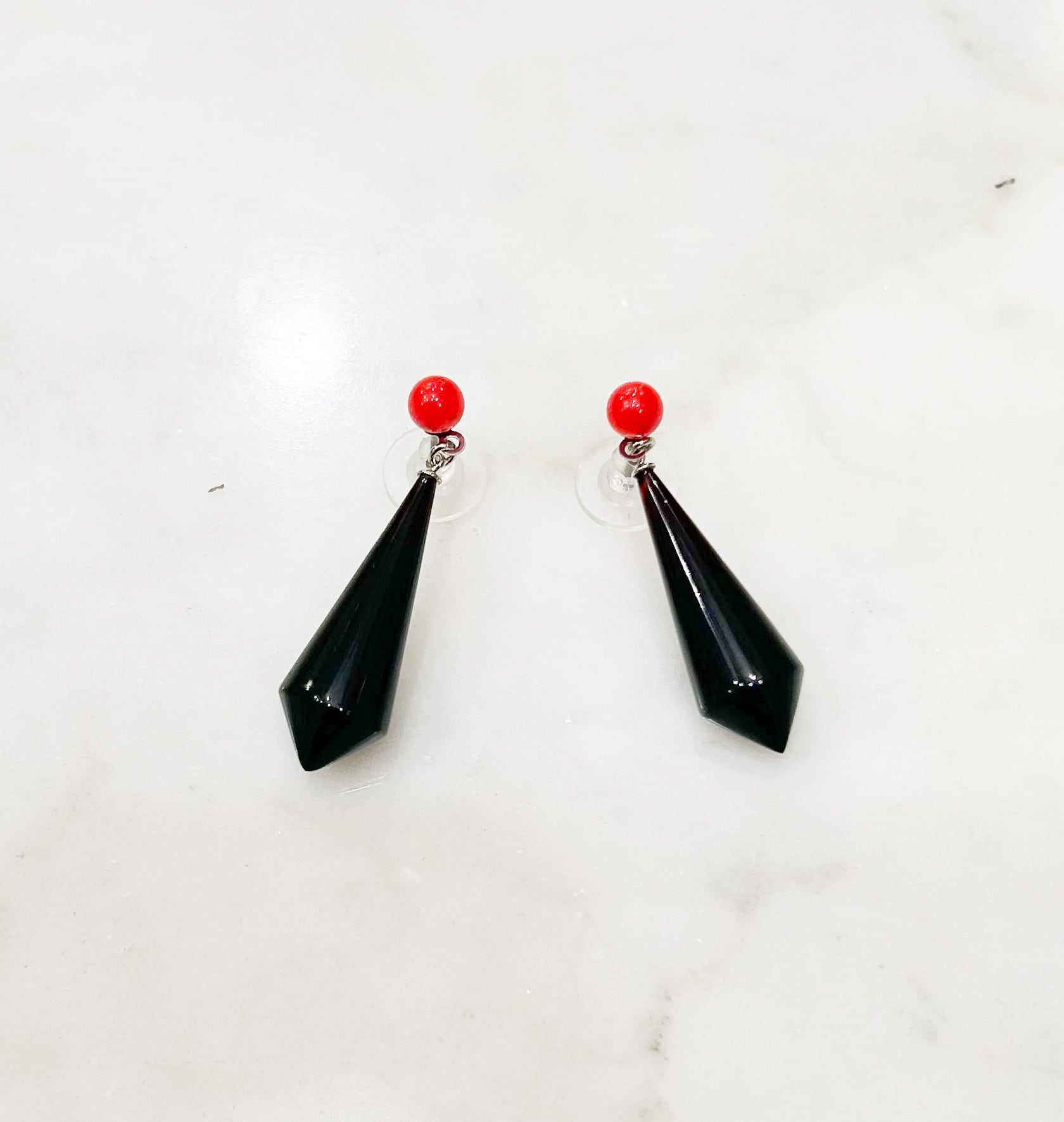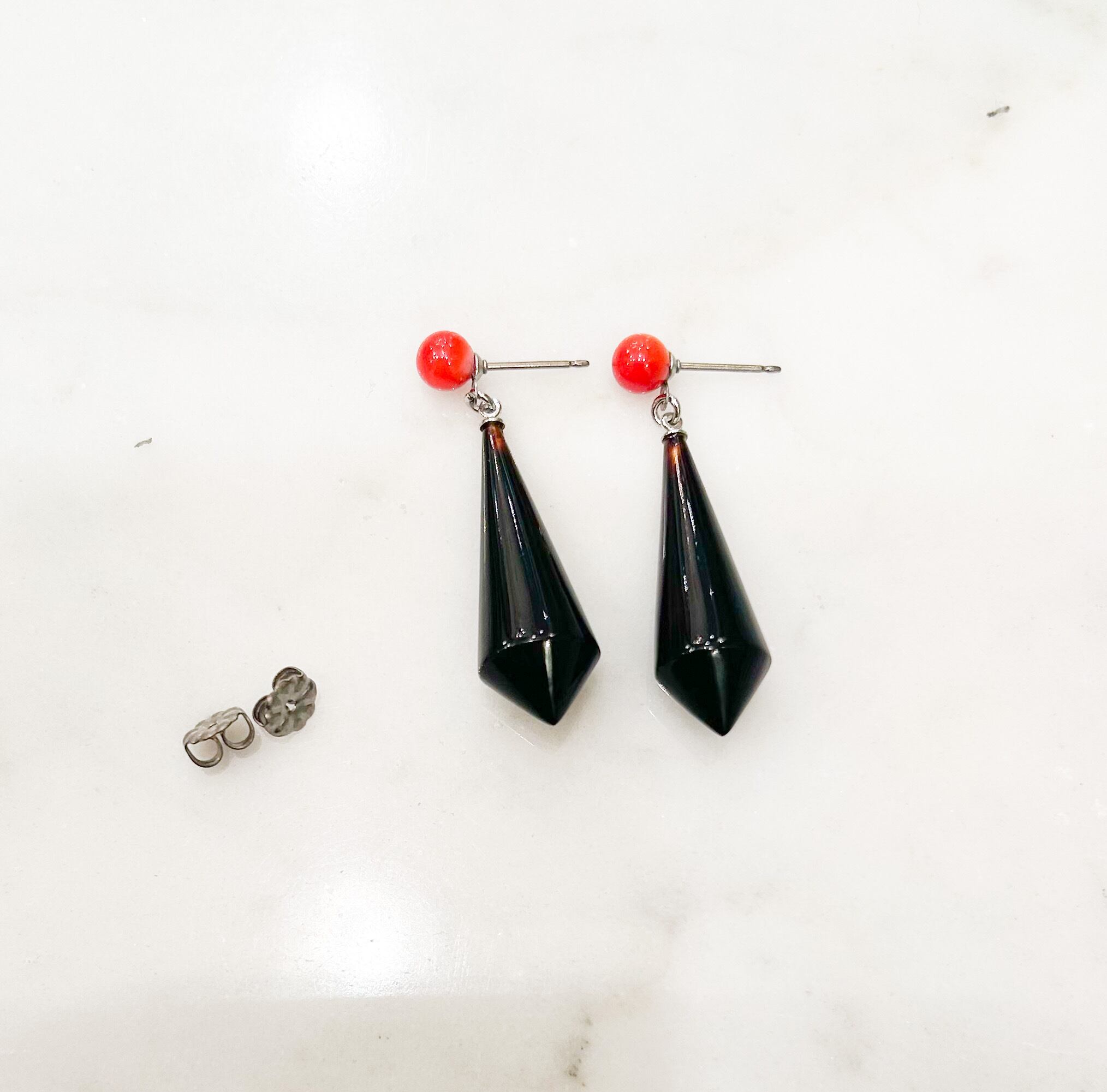 小さめの赤珊瑚から揺れる黒いスッキリシェイプのべっ甲のピアスはとても付け映えがします。
