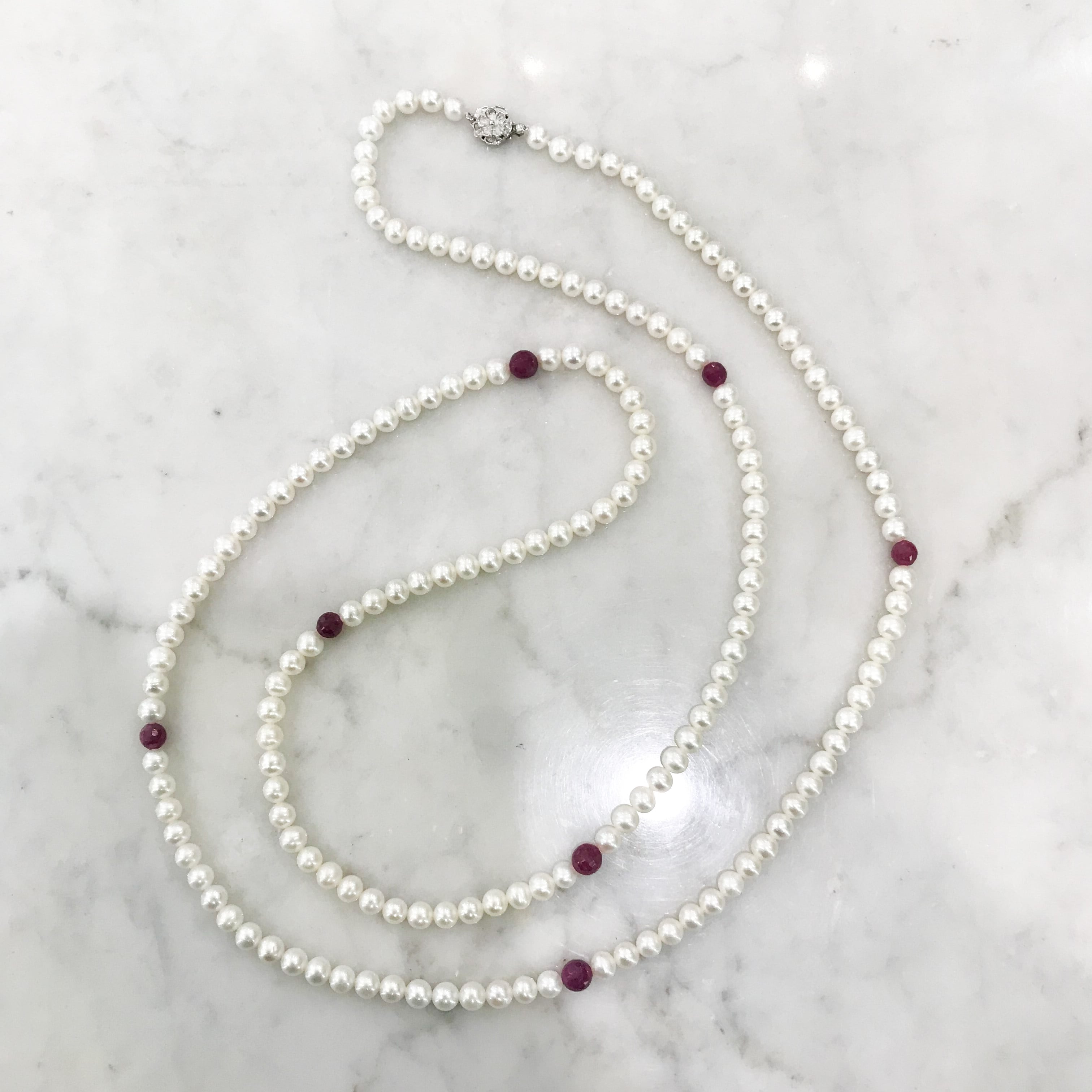 直径6.5㎜~7.0㎜の淡水パールに、濃いピンクのサファイアを組みあわせたロングネックレスです。